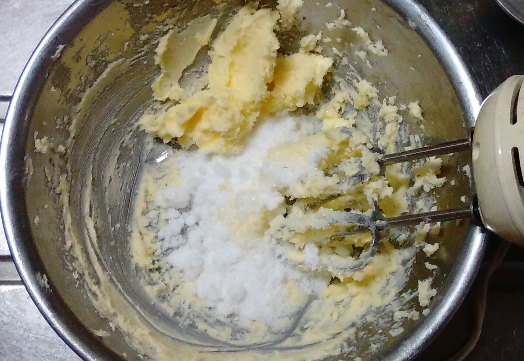 ①バターをホイップし、グラニュー糖を2~3回に分けて入れる。