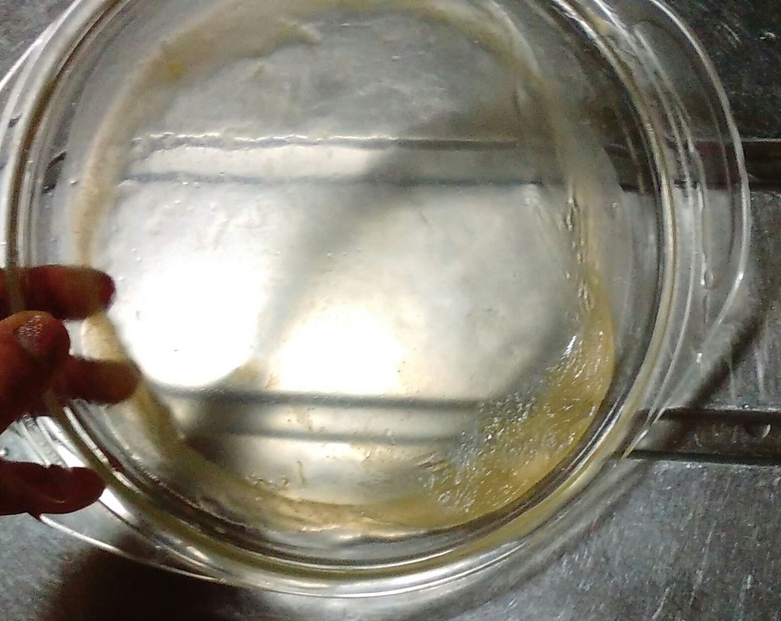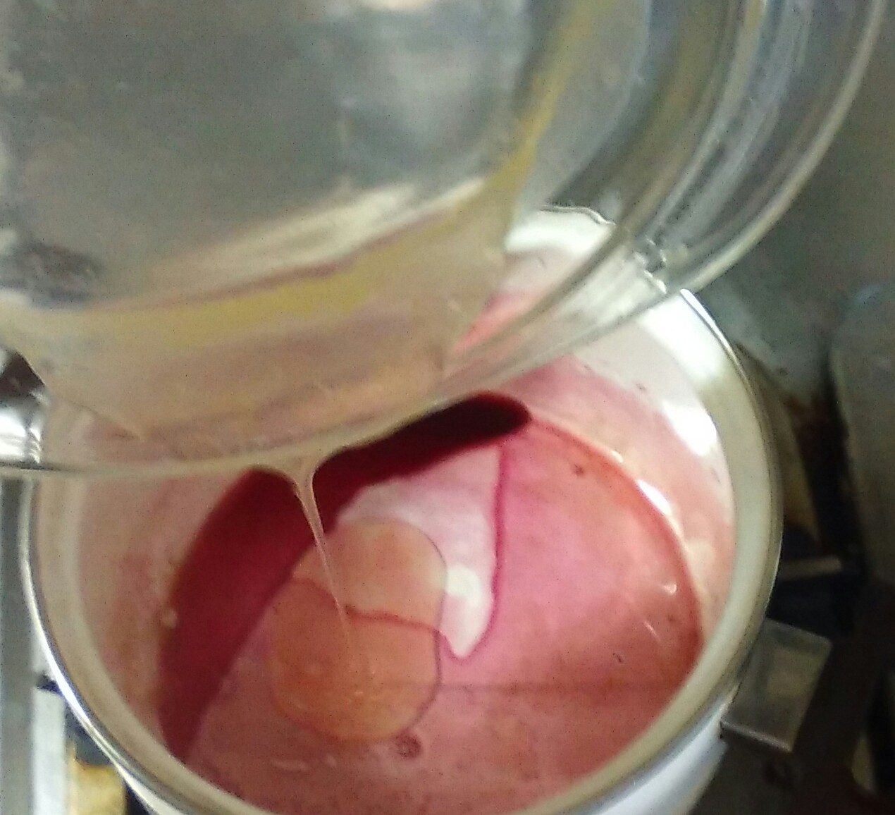 ③水で溶いた重曹を入れて混ぜ、生クリームも入れてさらに混ぜ、バニラエッセンスを、良い匂いがするまで入れて混ぜる。