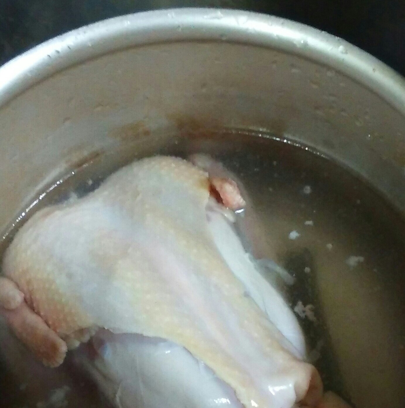 ①たっぷりのお湯沸かし鶏を入れ、ひと煮たちさせて取りだし流水でキレイに残っている内臓などを洗い流す。