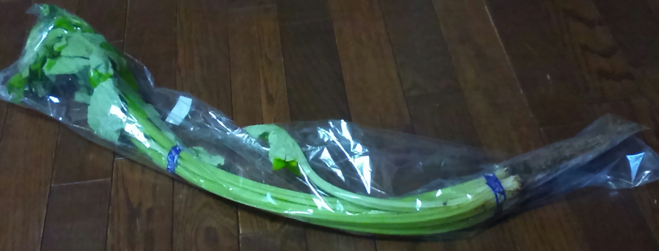 買い物のビニールからはみ出すし、葉っぱの部分が垂れ下がろうとするし、根っこのごぼう部分は土がついたままだし。