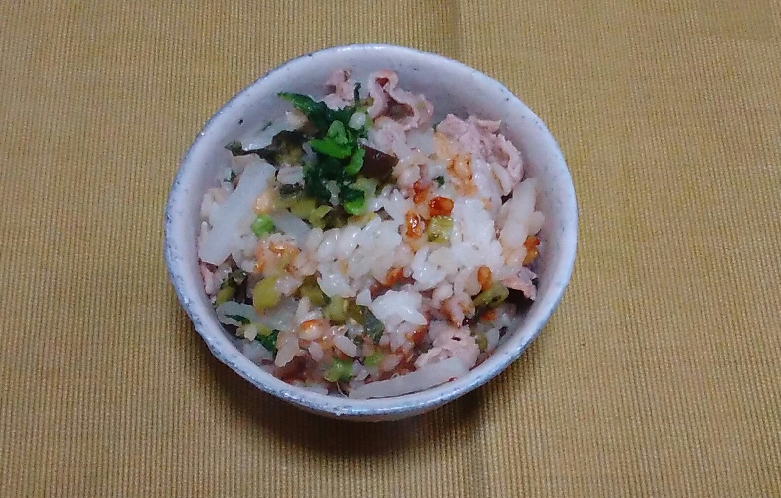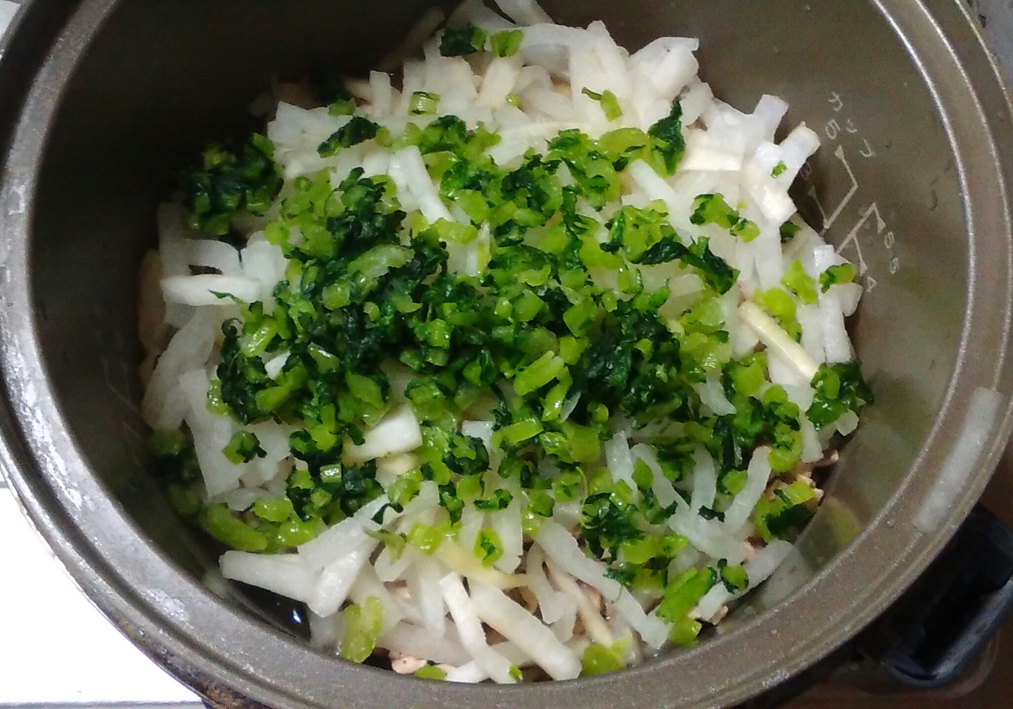 ④炒めた豚肉、水をしぼった大根、大根葉の1/2量(根本のほう)を入れ炊飯する。