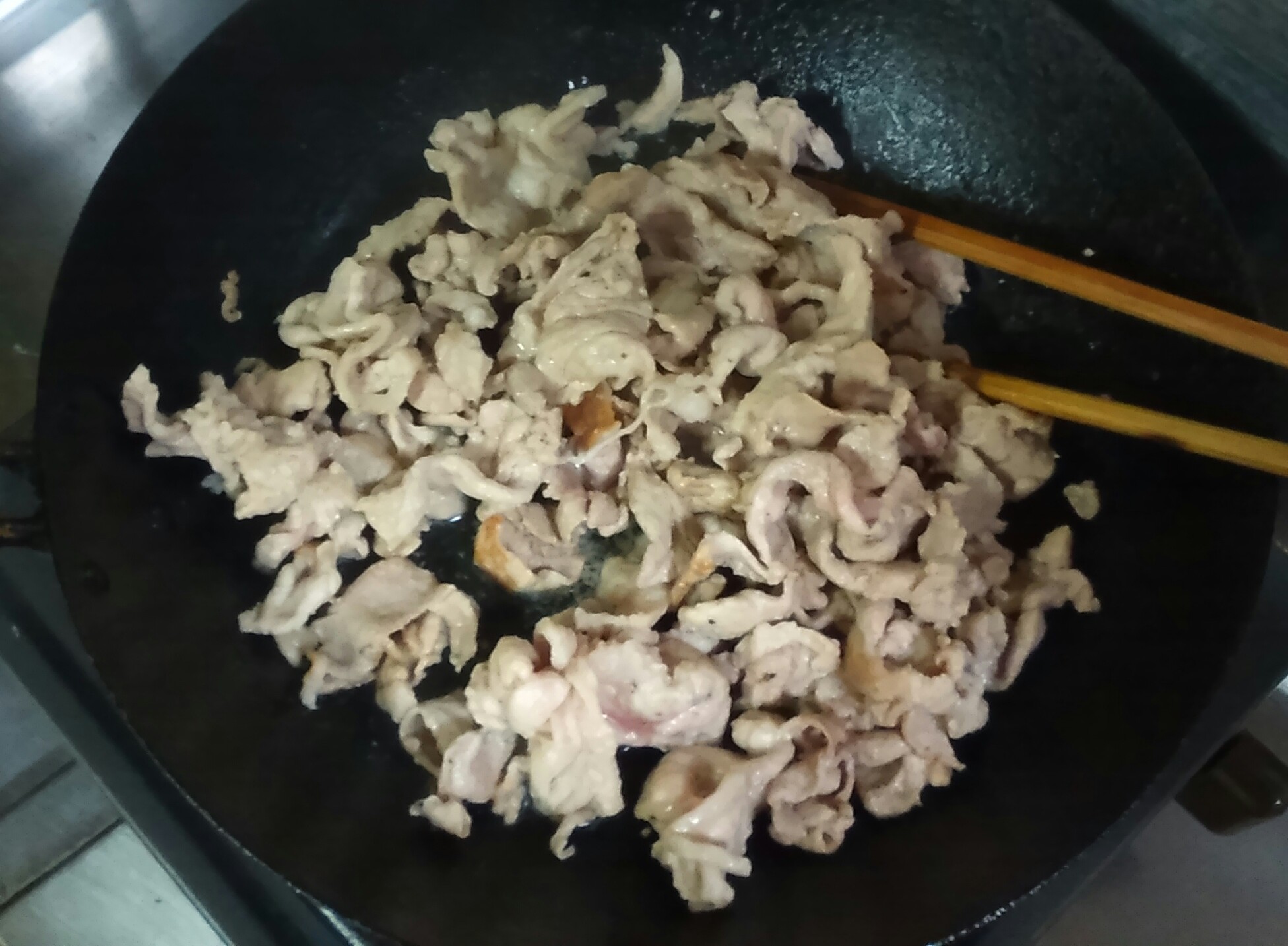 ②豚肉は酒で下味をつけ、ゴマ油を熱したフライパンで炒める。