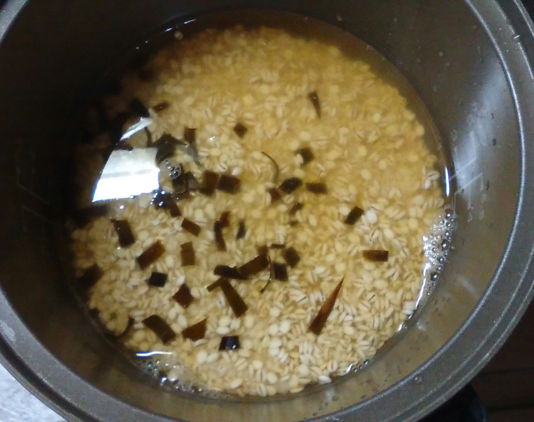 ③炊飯器に洗い米を入れ、水と醤油、だしの素を入れ(2合のメモリより若干少な目に調整します)、小さく切ったダシ昆布を入れる。