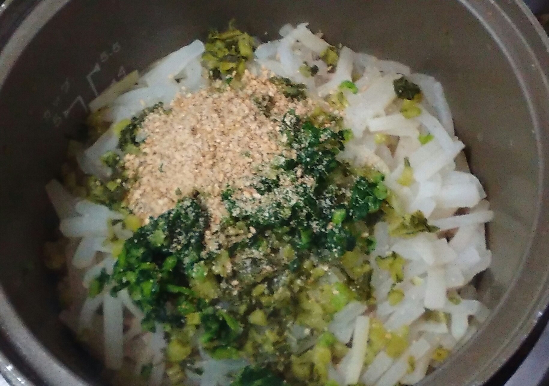 ⑤炊き上がれば、大根葉の残りを電子レンジにかけ、水にとってしぼっておいたものと、白ゴマを入れて混ぜれば完成です。