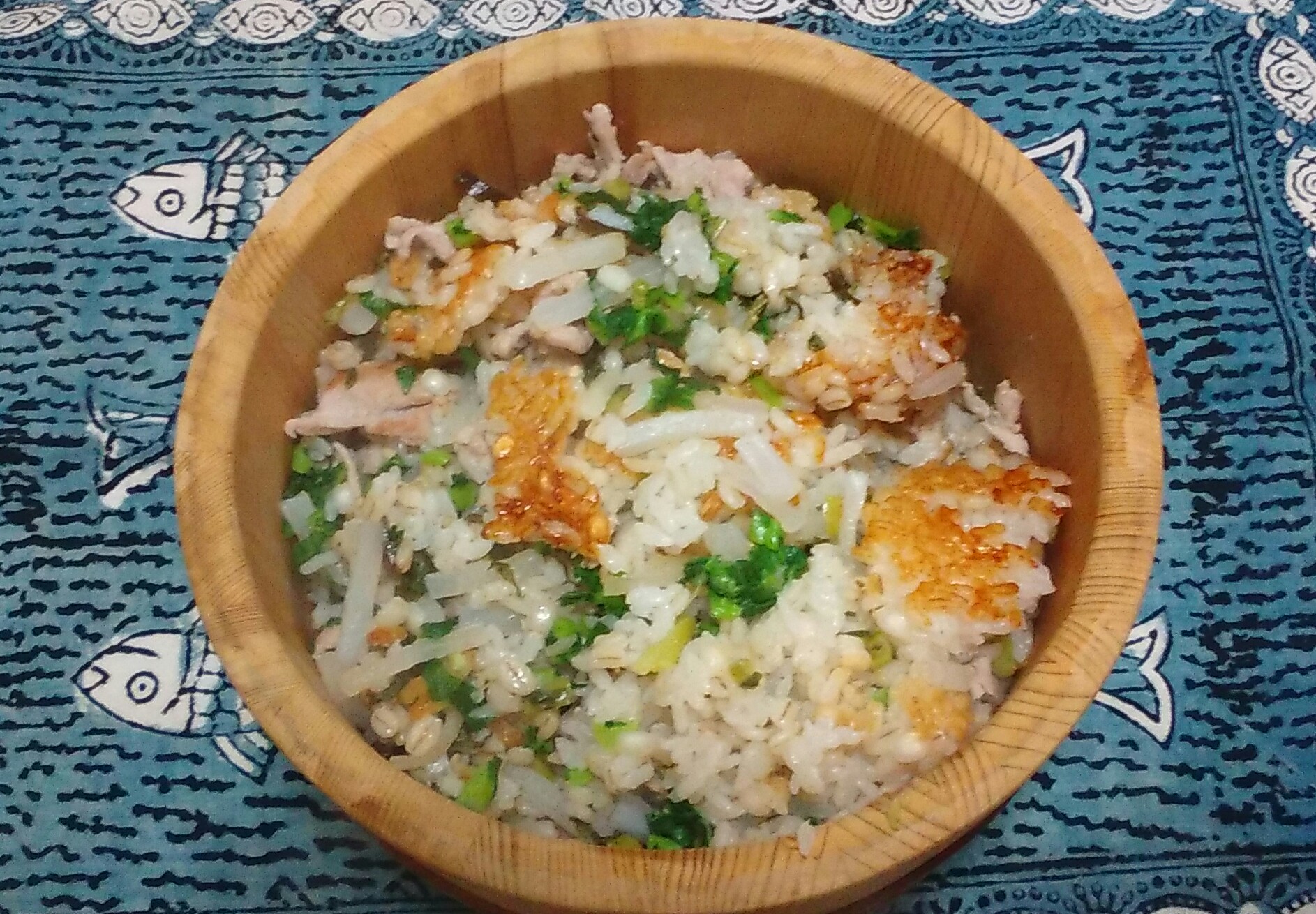 大根を皮つきのまま刻んで、葉も一緒に豚肉と炊き込む旬の『大根まるごと炊き込みご飯』レシピをどうぞ~♪