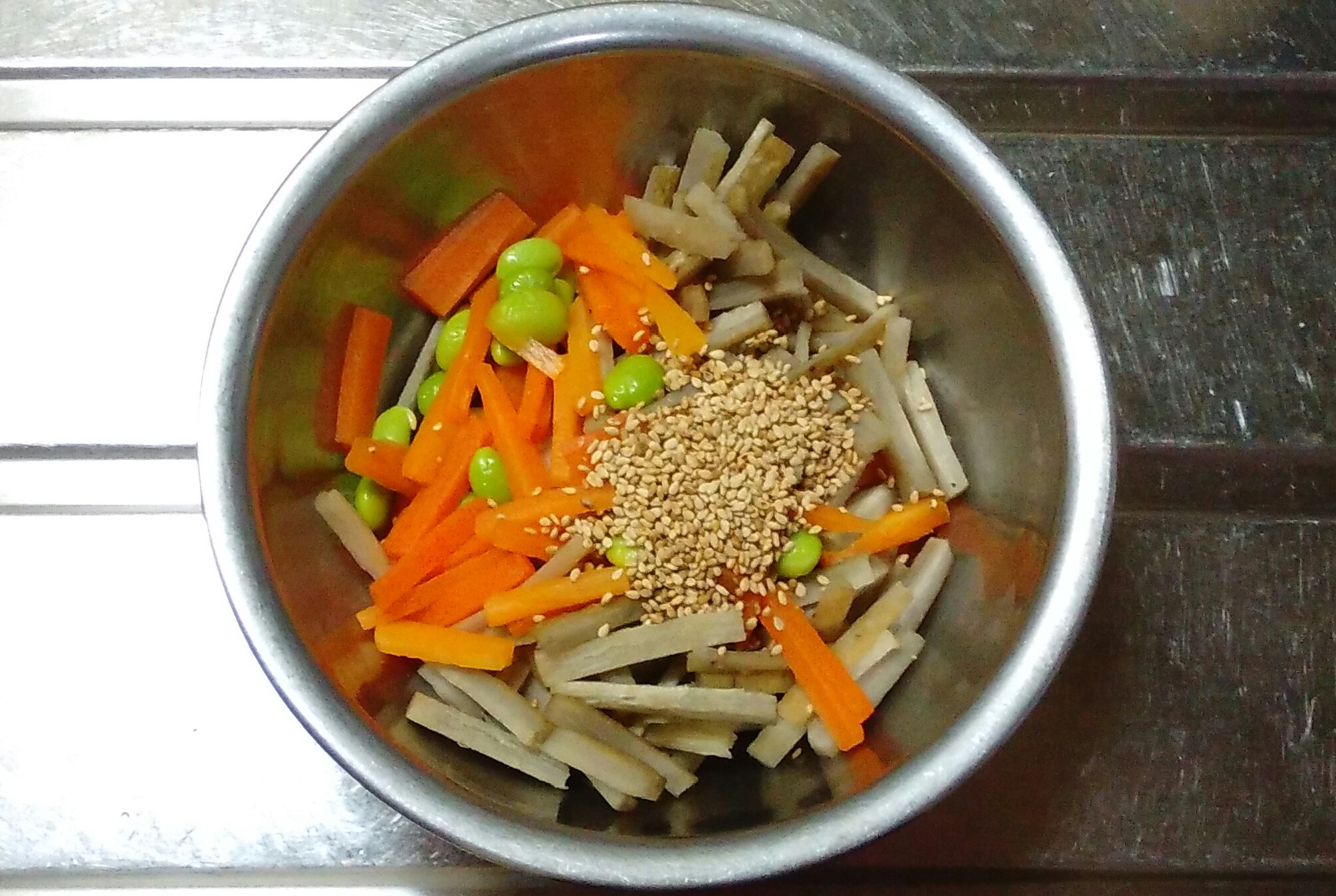③ニンジンとむき枝豆も、ごぼうと同様に加熱する。