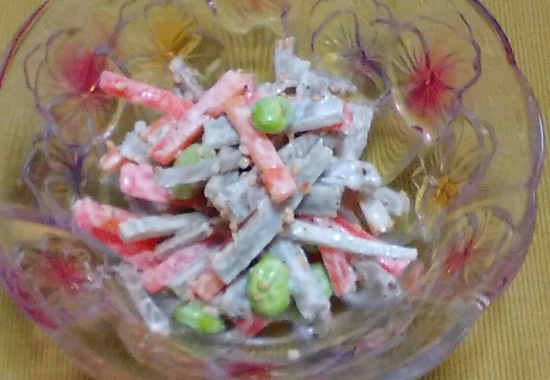 ④冷め②と③を、いりごま、マヨネーズ、塩、砂糖で和えれば完成です。