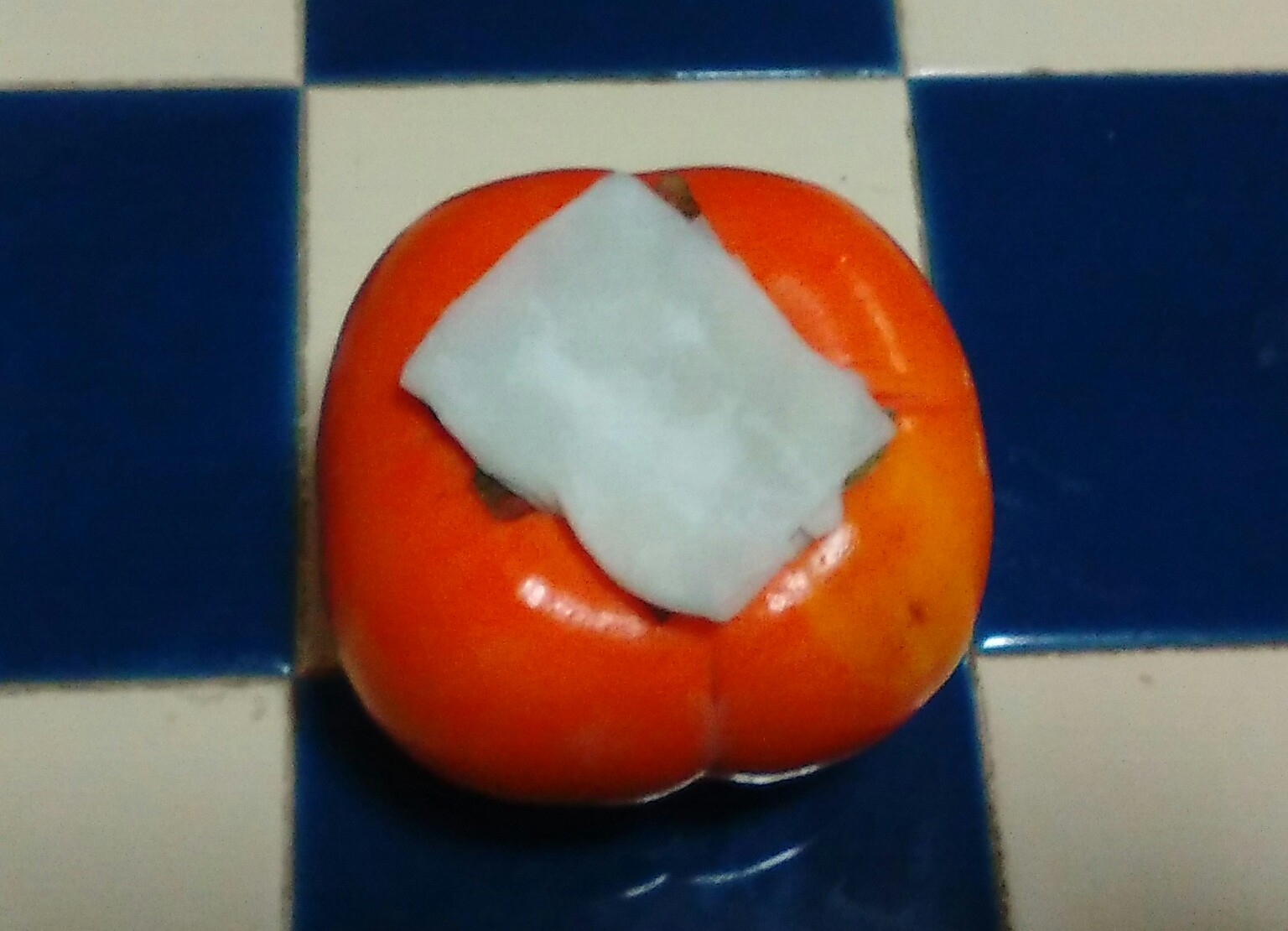 そのままではすぐに軟らかくなってしまうので、硬い柿がお好みの場合は、キッチンペーパーを小さく切り、水にひたしてヘタに貼り付けます。
