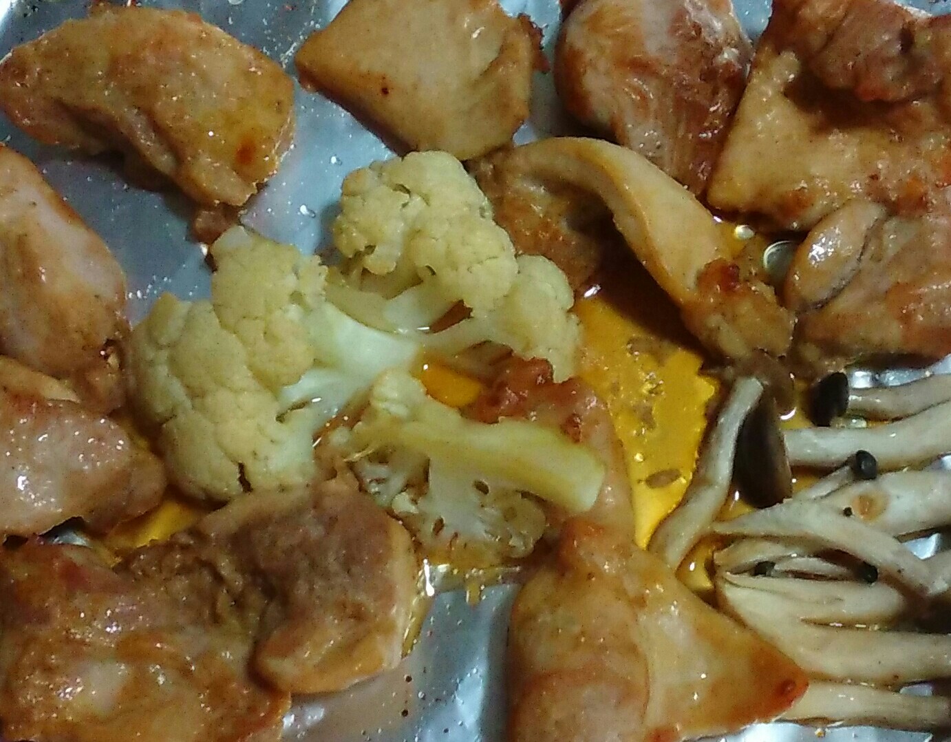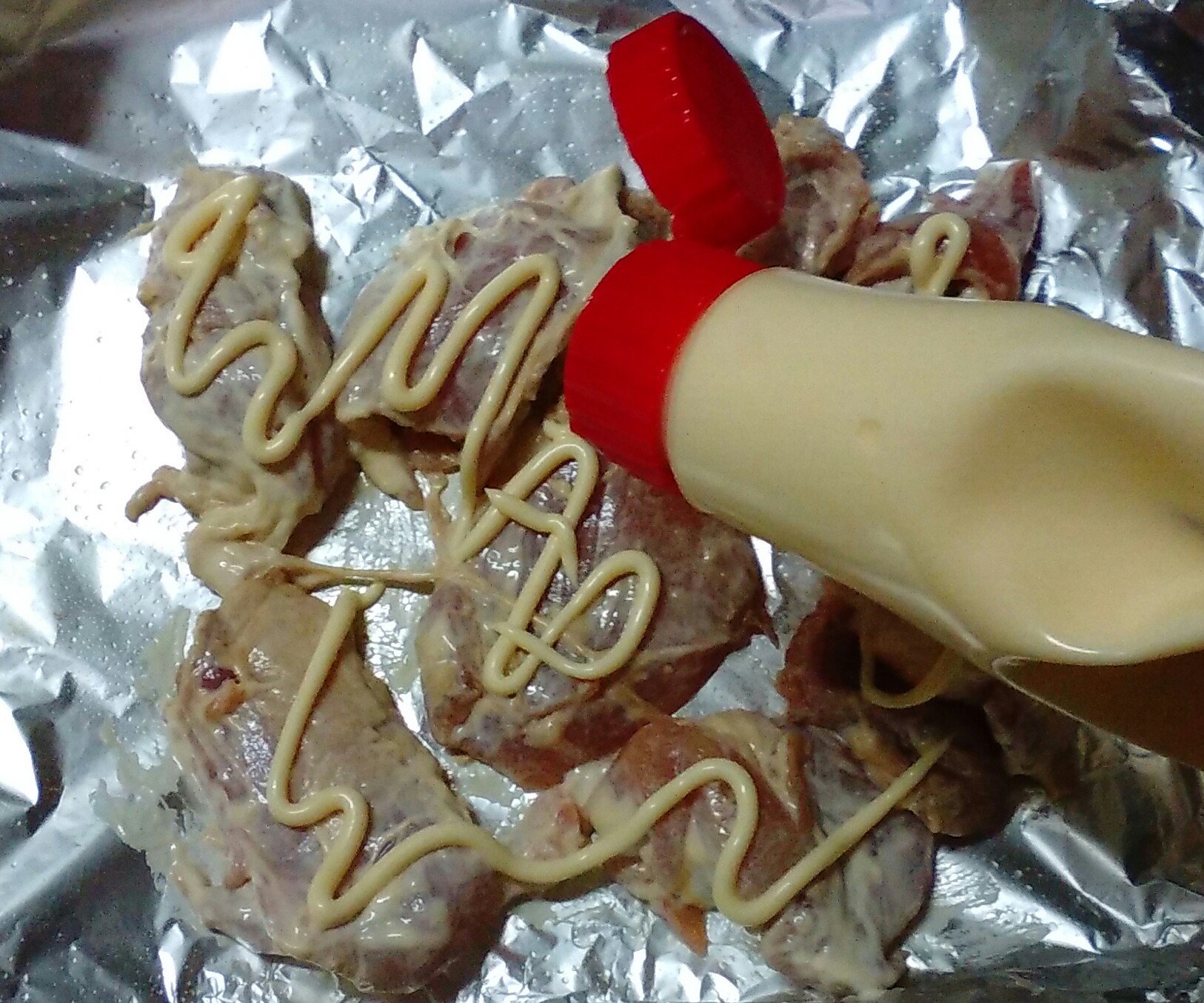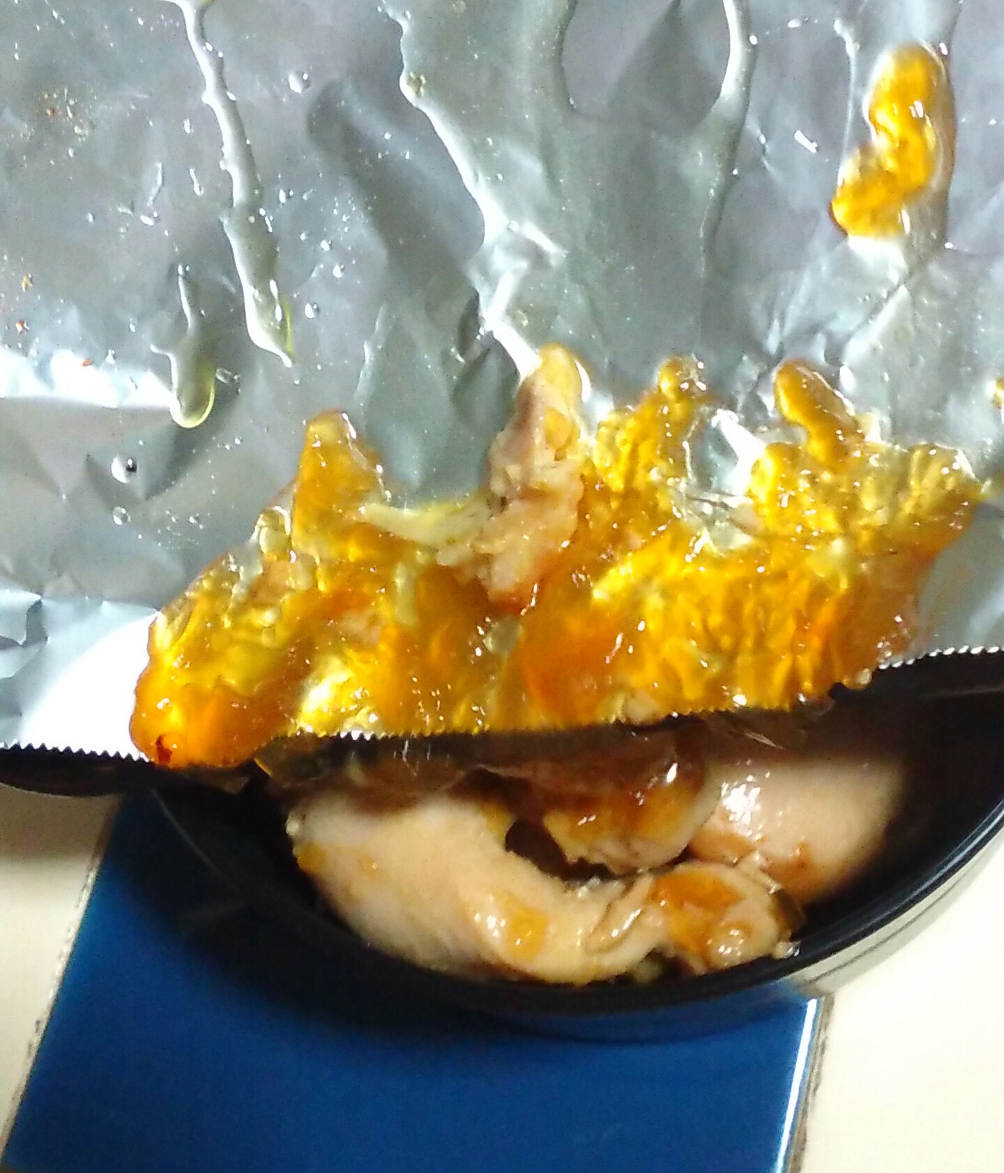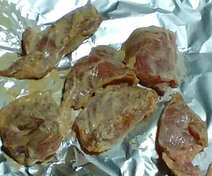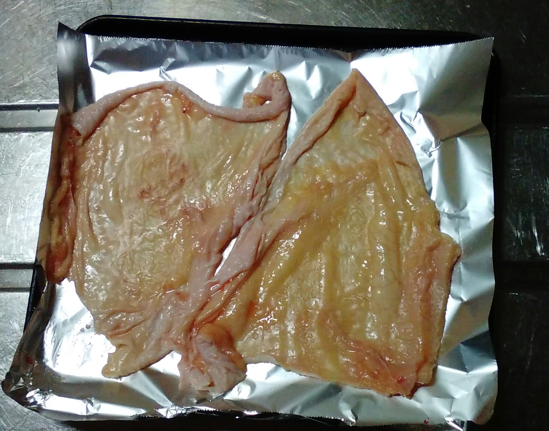 ②オーブントースター用の鉄板にくっつかないホイルを敷き、下味をつけた鶏を拡げる。