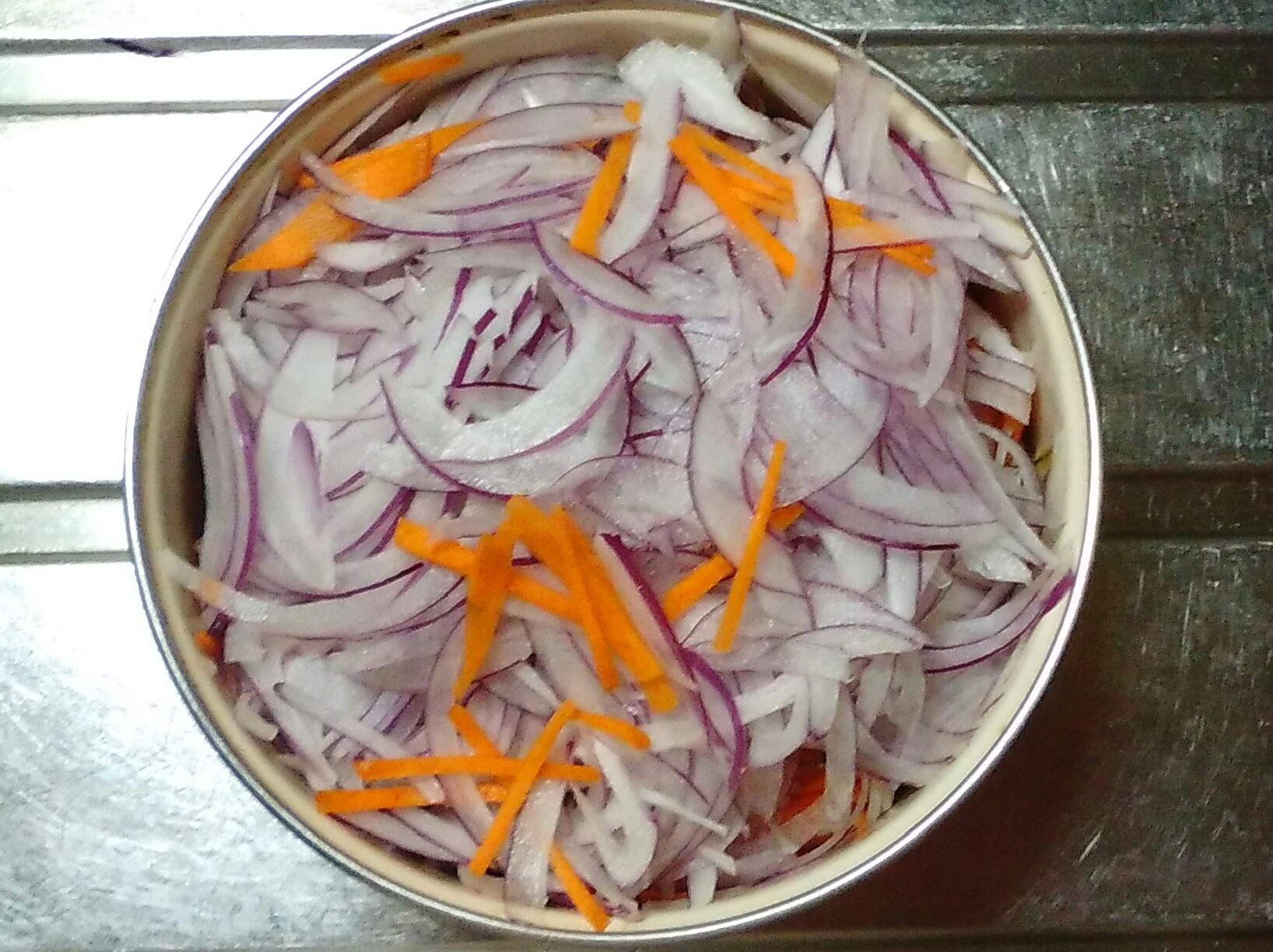 玉ねぎも入れ、野菜がつけ汁につかるよう時々返しながら冷蔵庫で味を染みこませる。