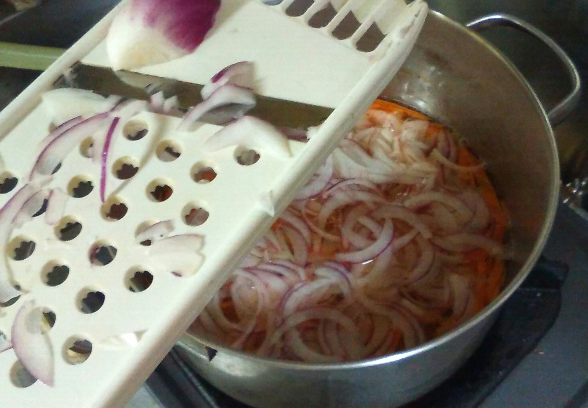 玉ねぎはスライサーでスライスしながら鍋に直接入れる。