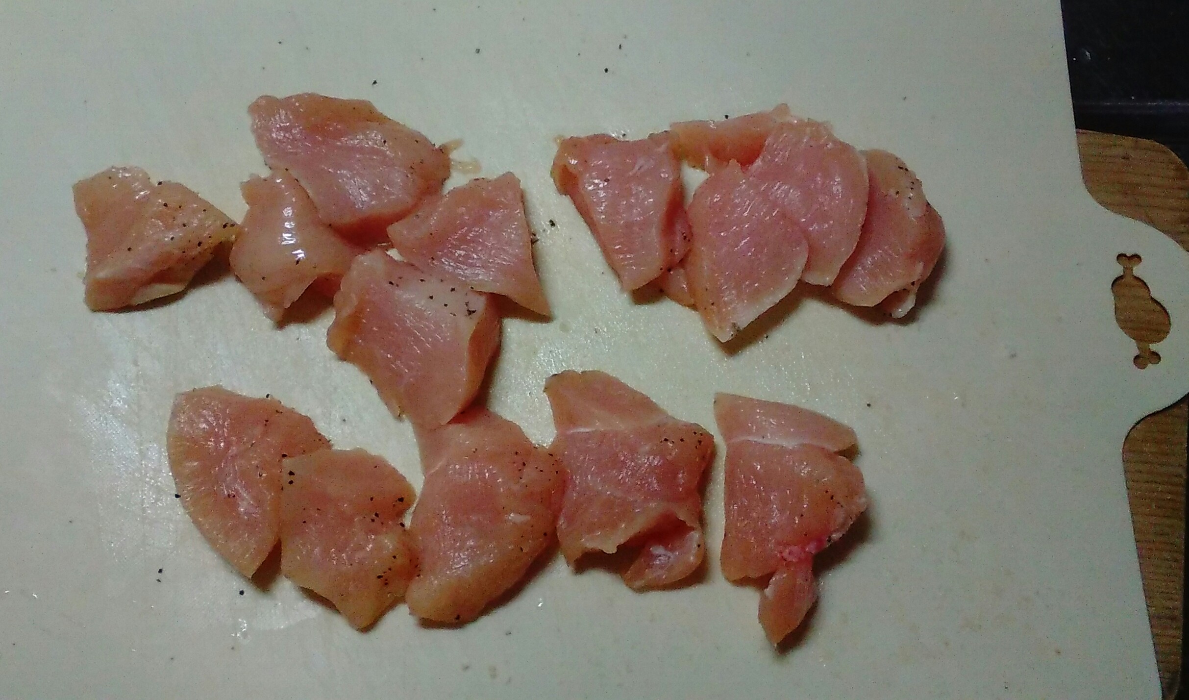 ③鶏をビニール袋に入れ、片栗粉を入れてふくらませた状態で袋を振り片栗粉を薄くまぶす。