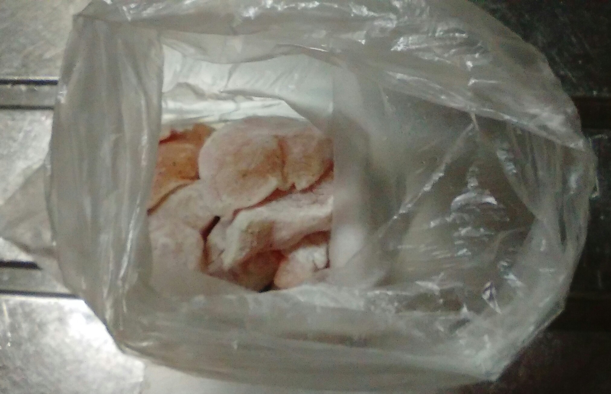 ②ビニール袋に入れ、小麦粉を入れてふくらませた状態で袋を振り小麦粉を薄くまぶす。