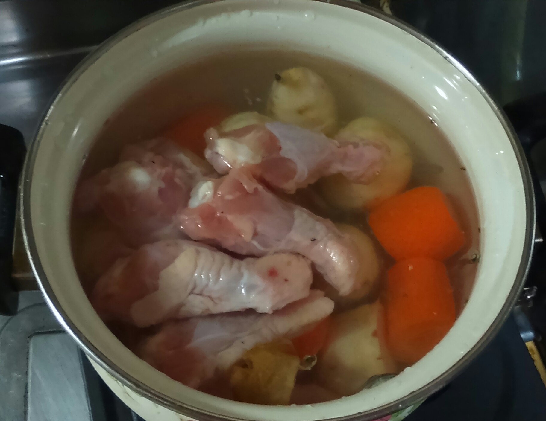 また、ぶつ切りの骨付き鶏もも肉が手に入らなかったので手羽元を使いました。