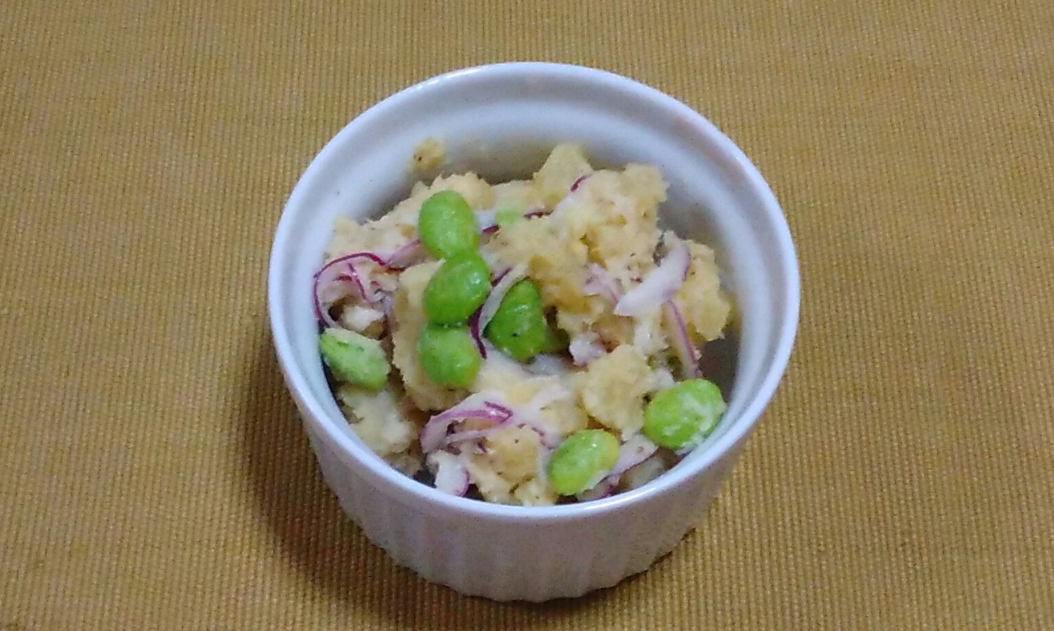 余ったサツマイモは皮をむき、むき枝豆とオニオンスライス、マヨネーズで和えてサラダに。