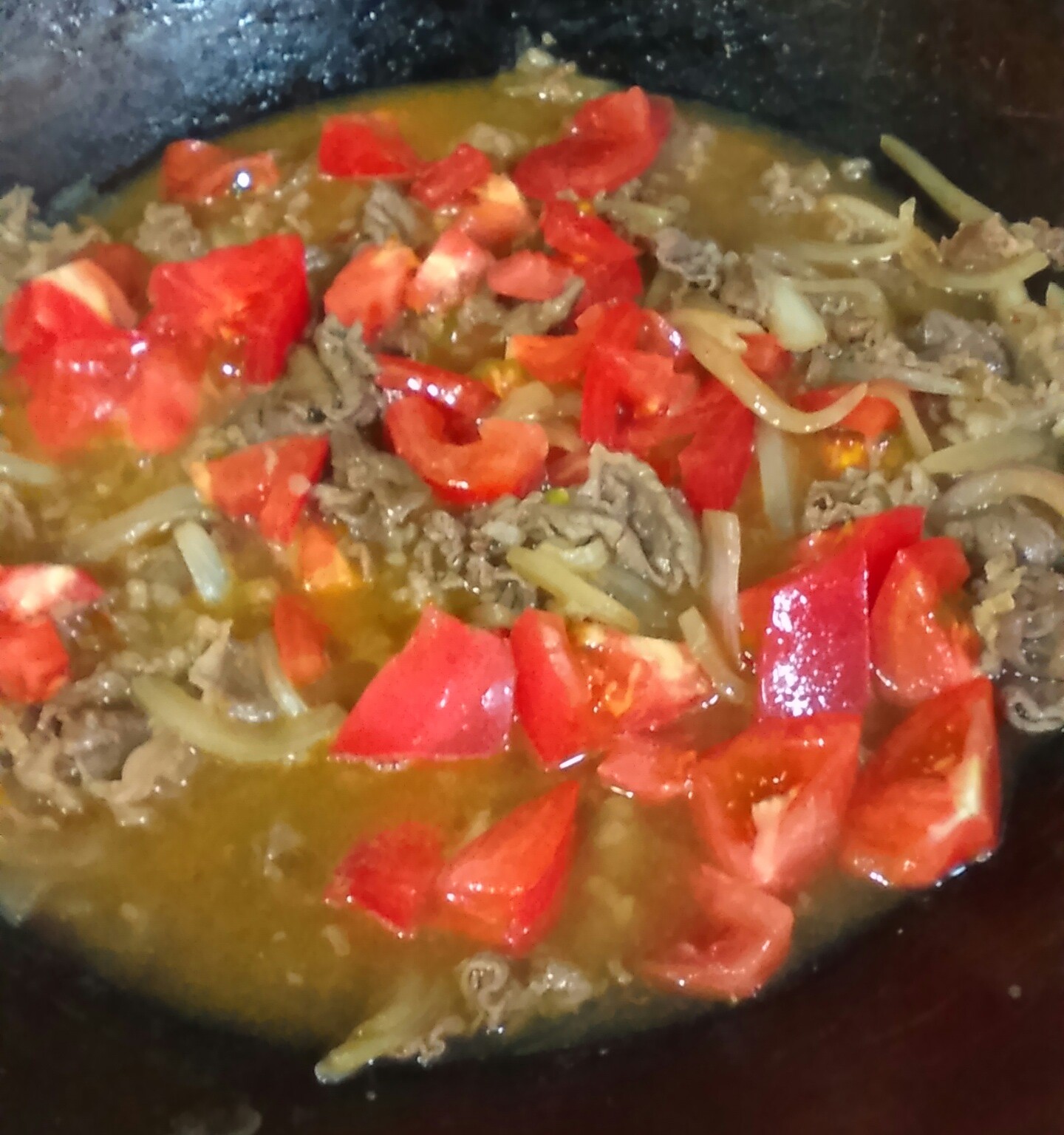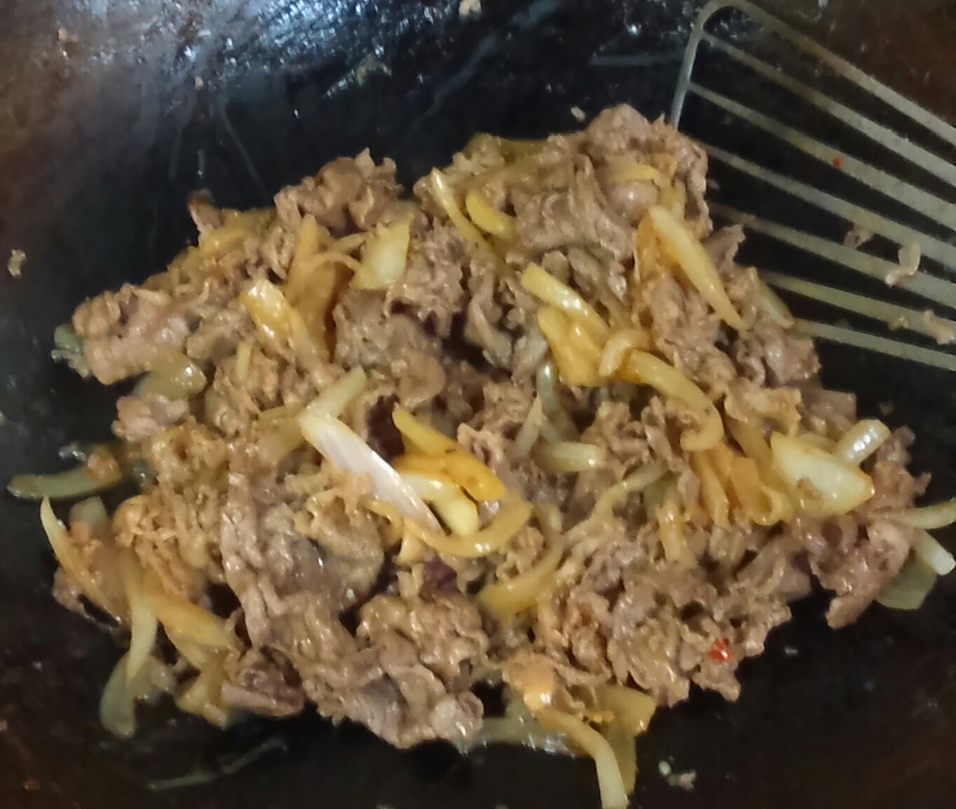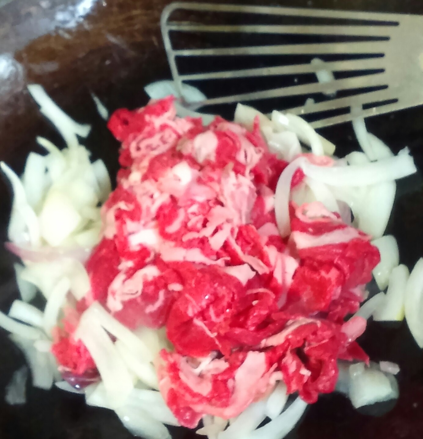 玉ねぎが透き通れば牛肉を入れてさらに炒める。