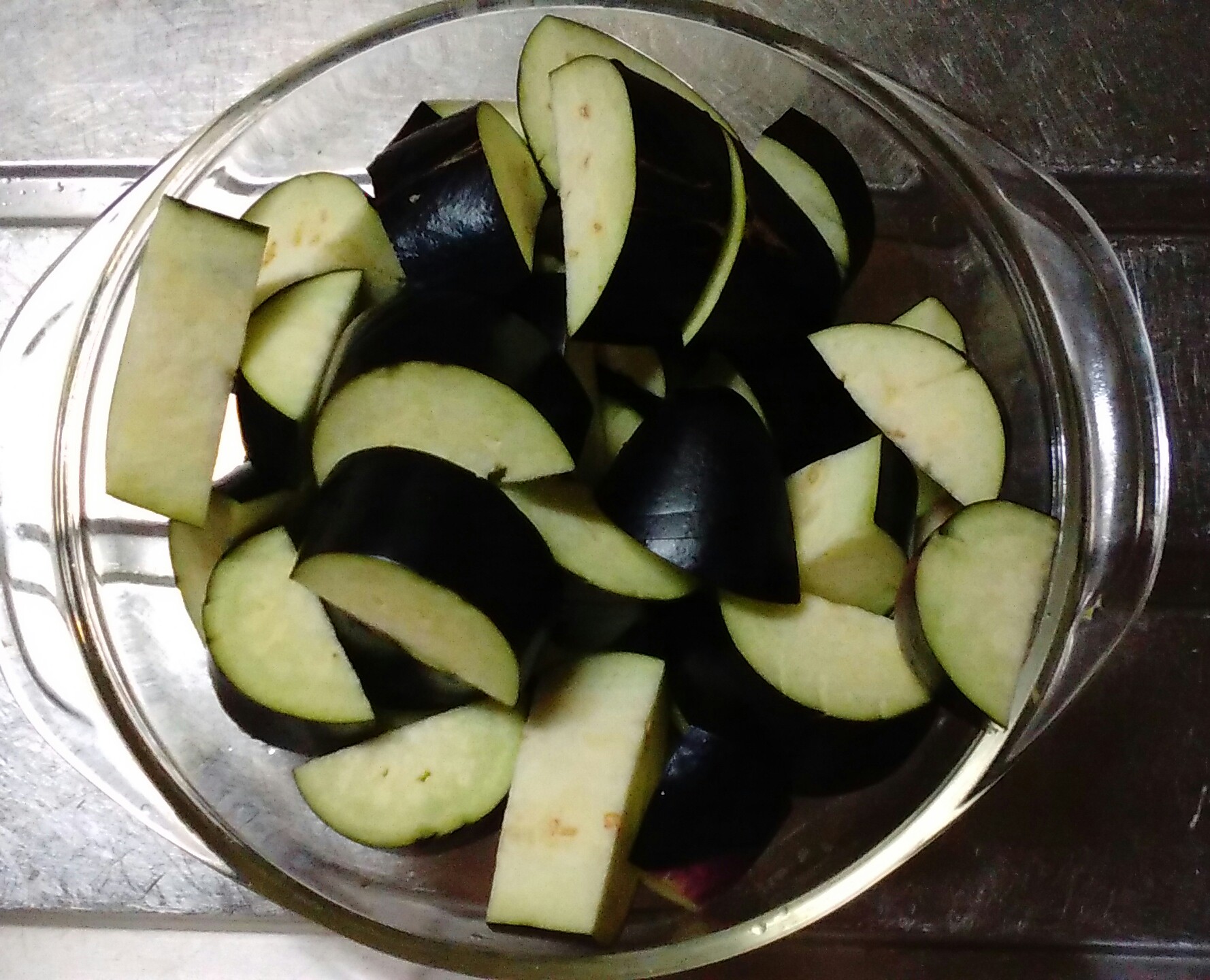 茄子は2㎝ほどの厚めの半月、もしくは乱切りにし、600Wの電子レンジで5分ほど加熱する。