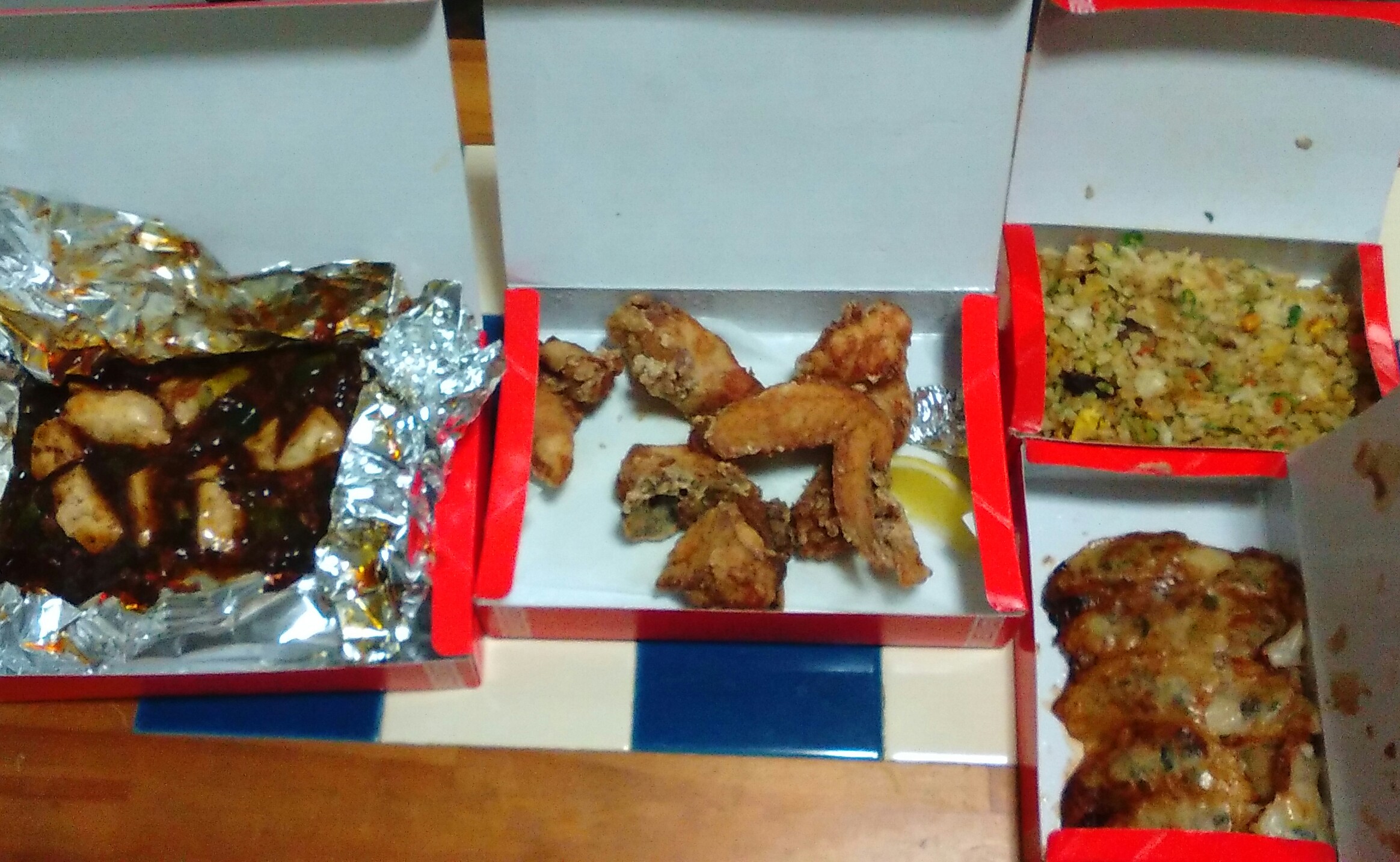 炒飯と麻婆豆腐はレンチン、唐揚げはオーブントースター、餃子はフライパンで温め直し完了!