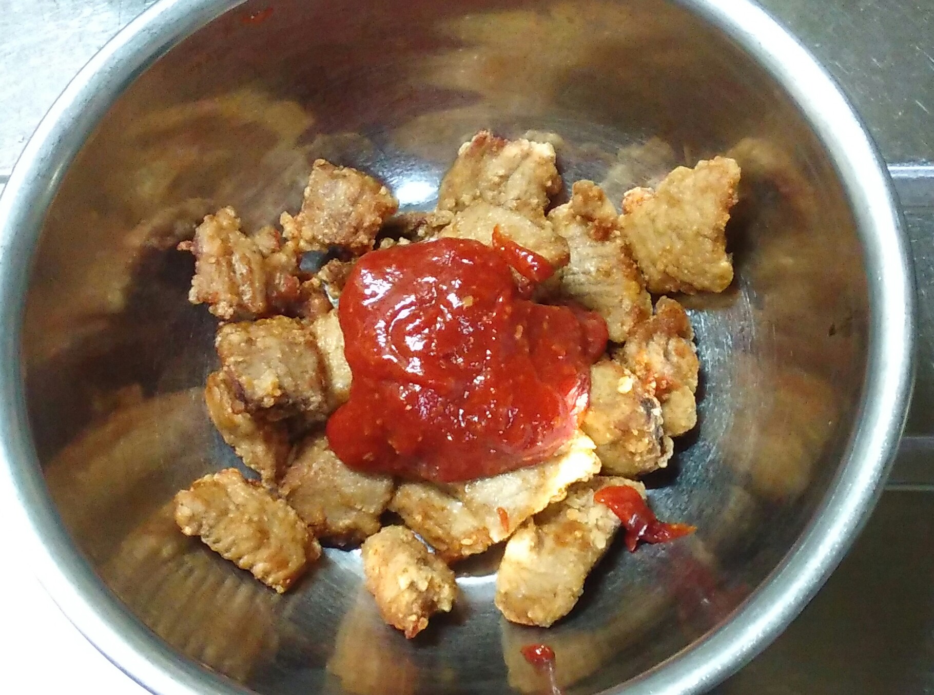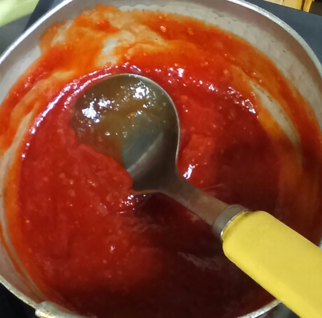 ②ケチャップ、赤味噌、砂糖をよく混ぜ合わせ火にかける。ふつふつしてくればOK。
