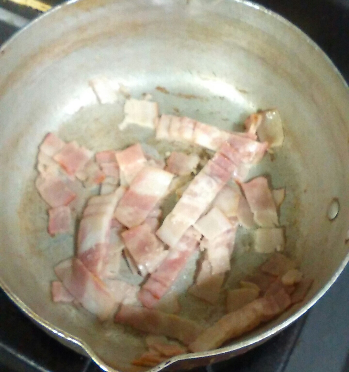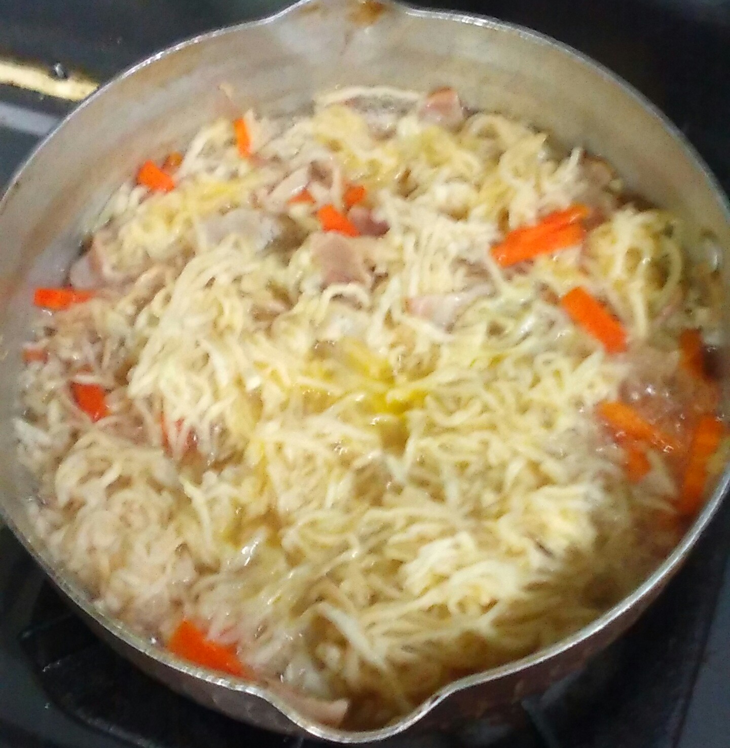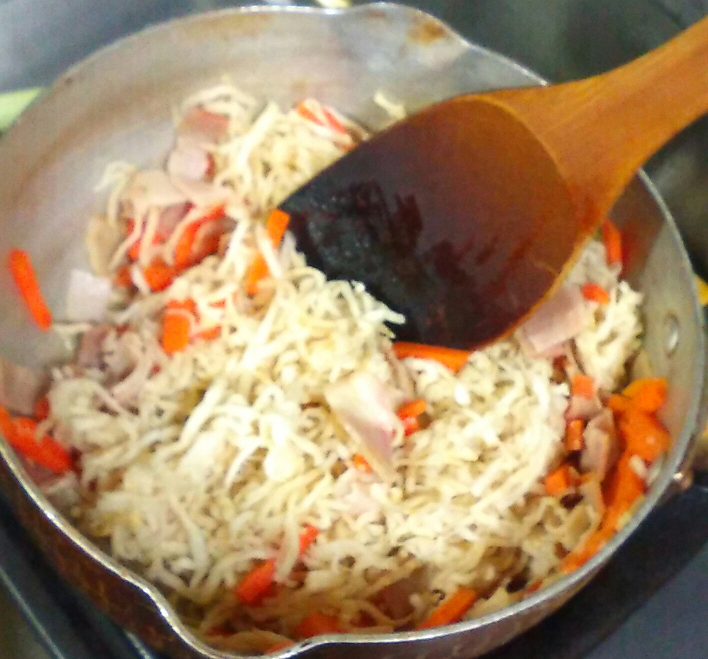 ③ベーコンから油が出てくれば、人参、切り干し大根の順に炒める。
