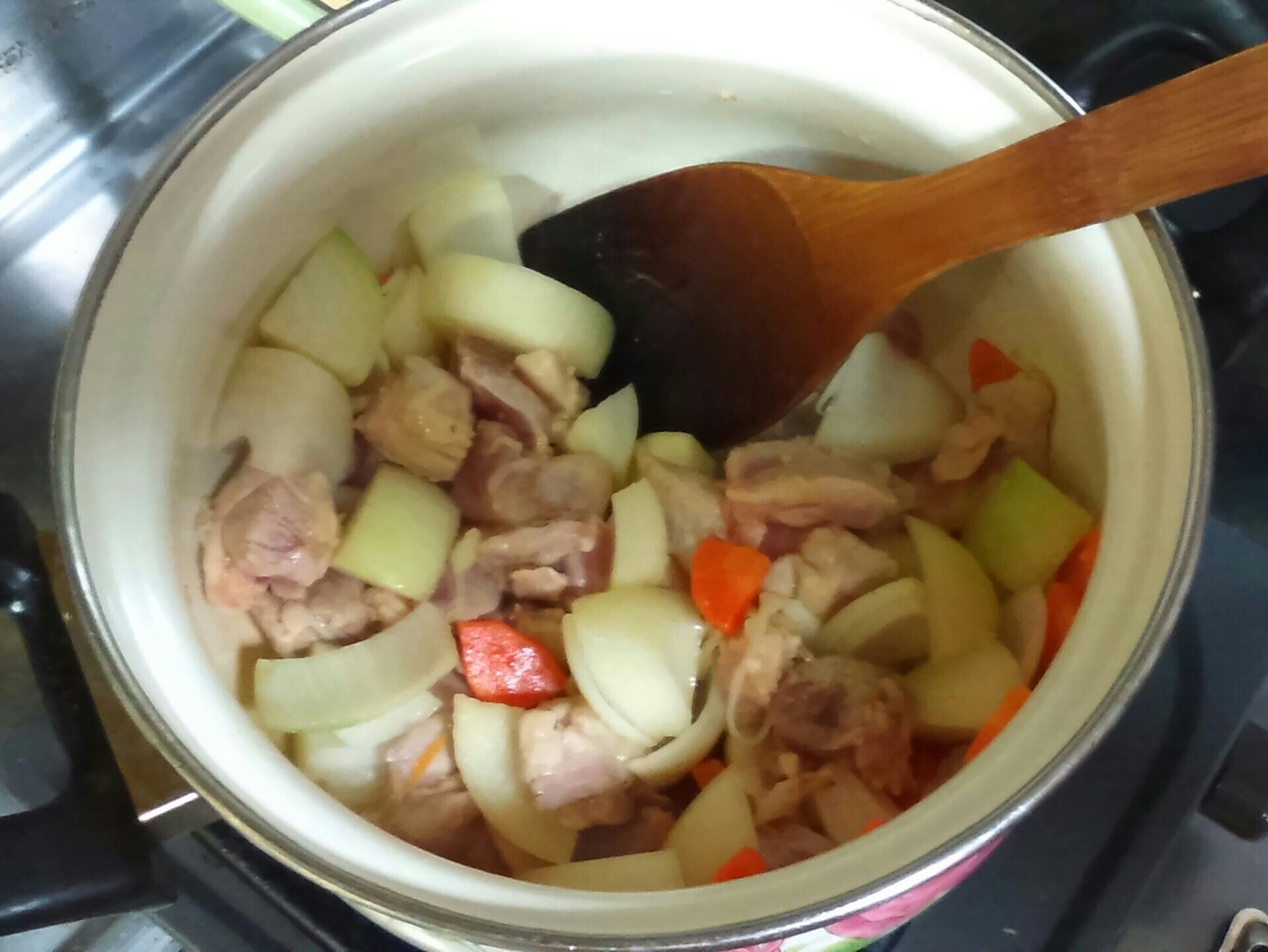 水の量が少なく感じると思いますが、野菜から水分が出てちょうどよくなります。
