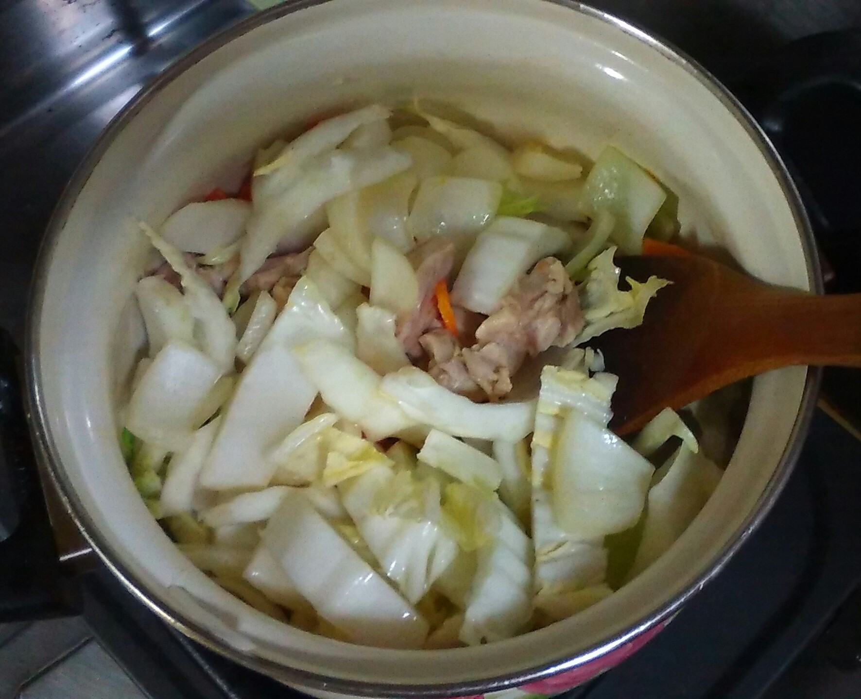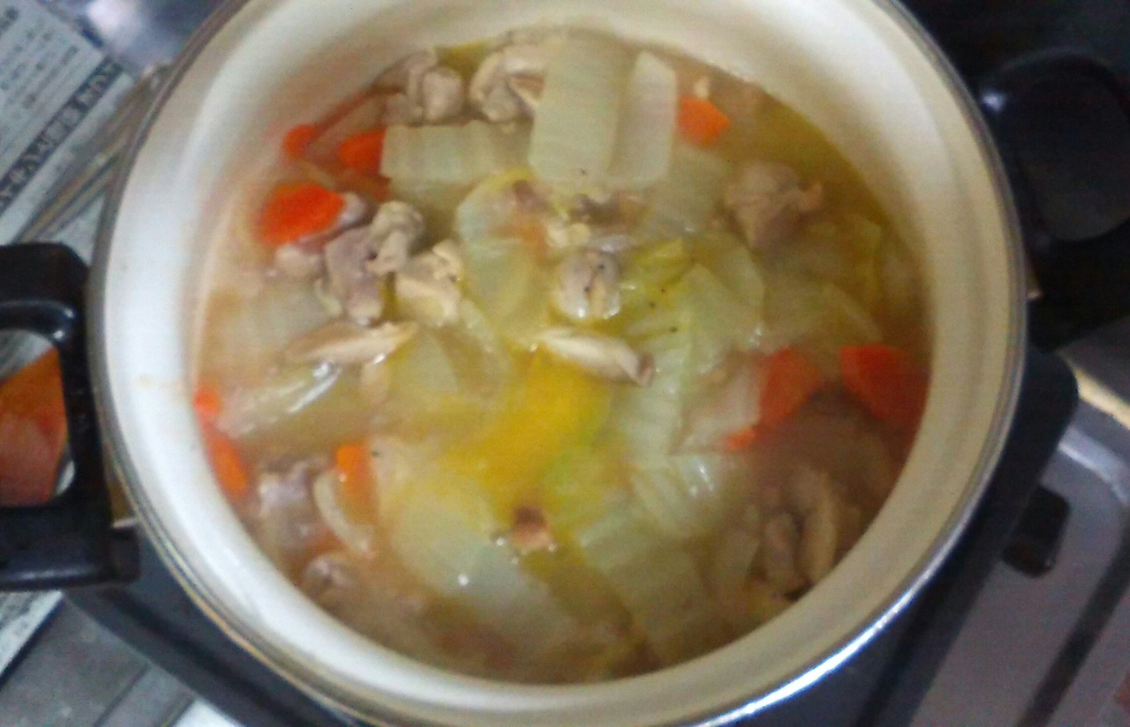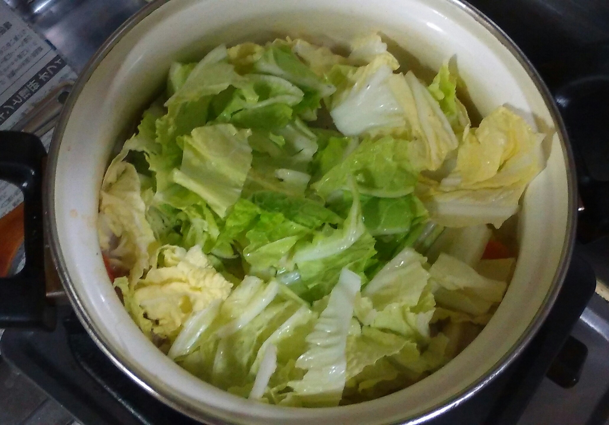 ④煮えれば白菜の葉を入れ、塩、コショウ、薄口醤油で味付けする。