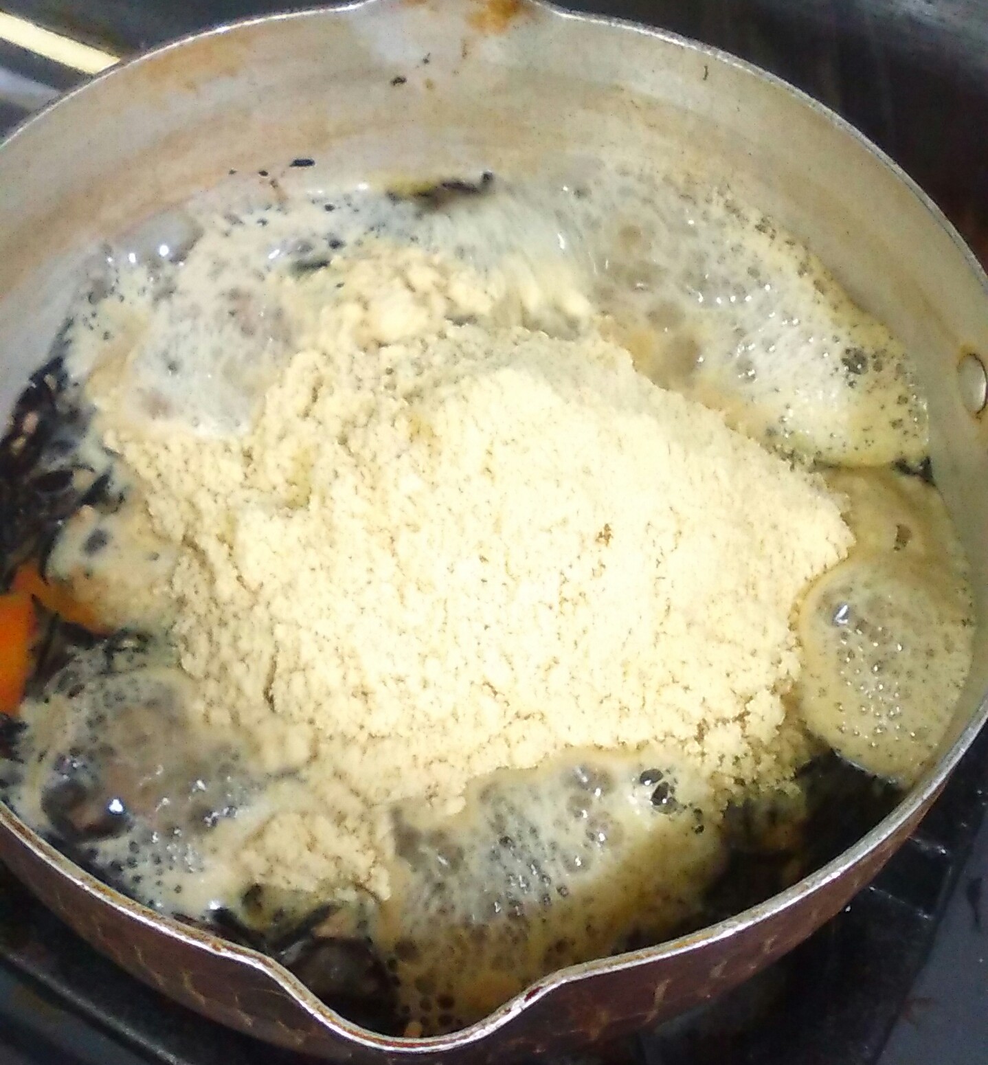 ・粉豆腐を入れると一気にダシ汁を吸いとられます。焦げ付きやすくなるので、火を弱め(中弱火)手早く混ぜながら火を通して下さい。