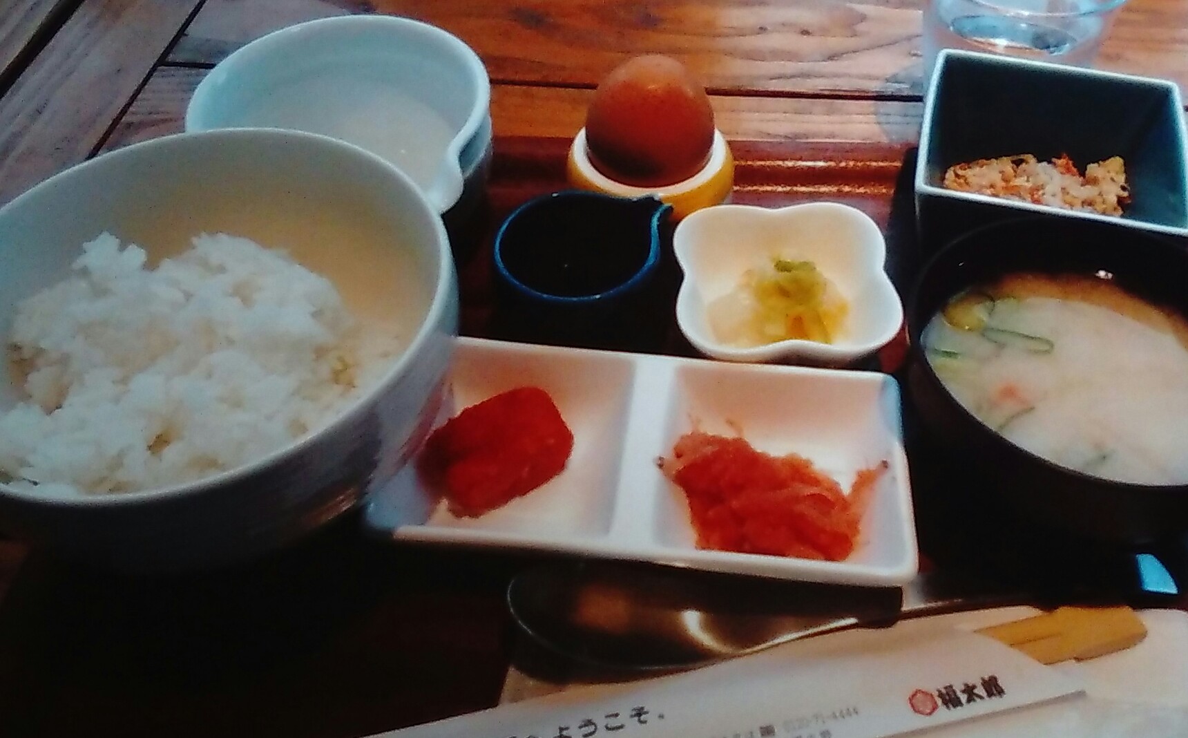 ランチは、ごはん、味噌汁、香の物、小鉢、生卵におかわり自由の明太子。