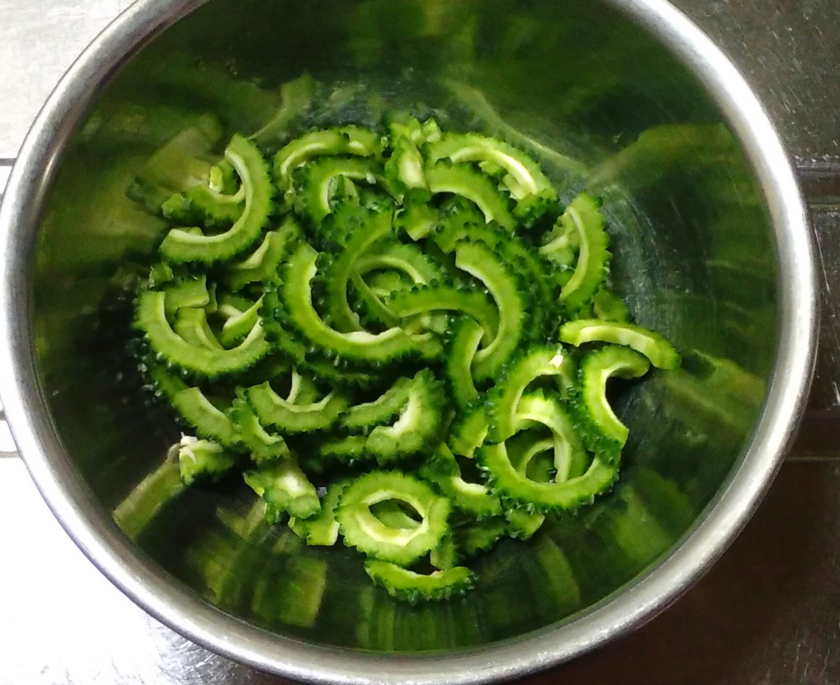 ③塩をしておいたゴーヤは、水を代えながら揉み洗いし苦みをとる。