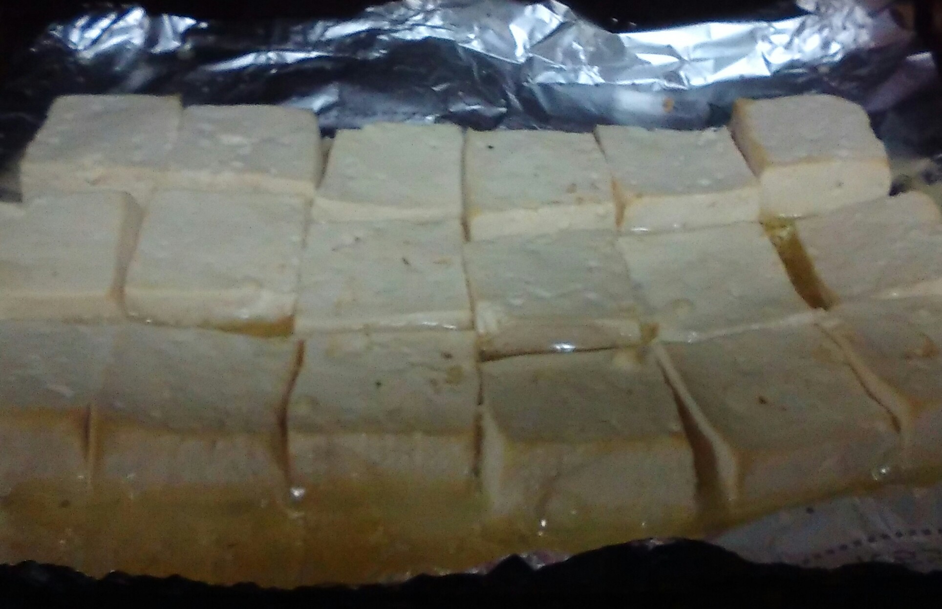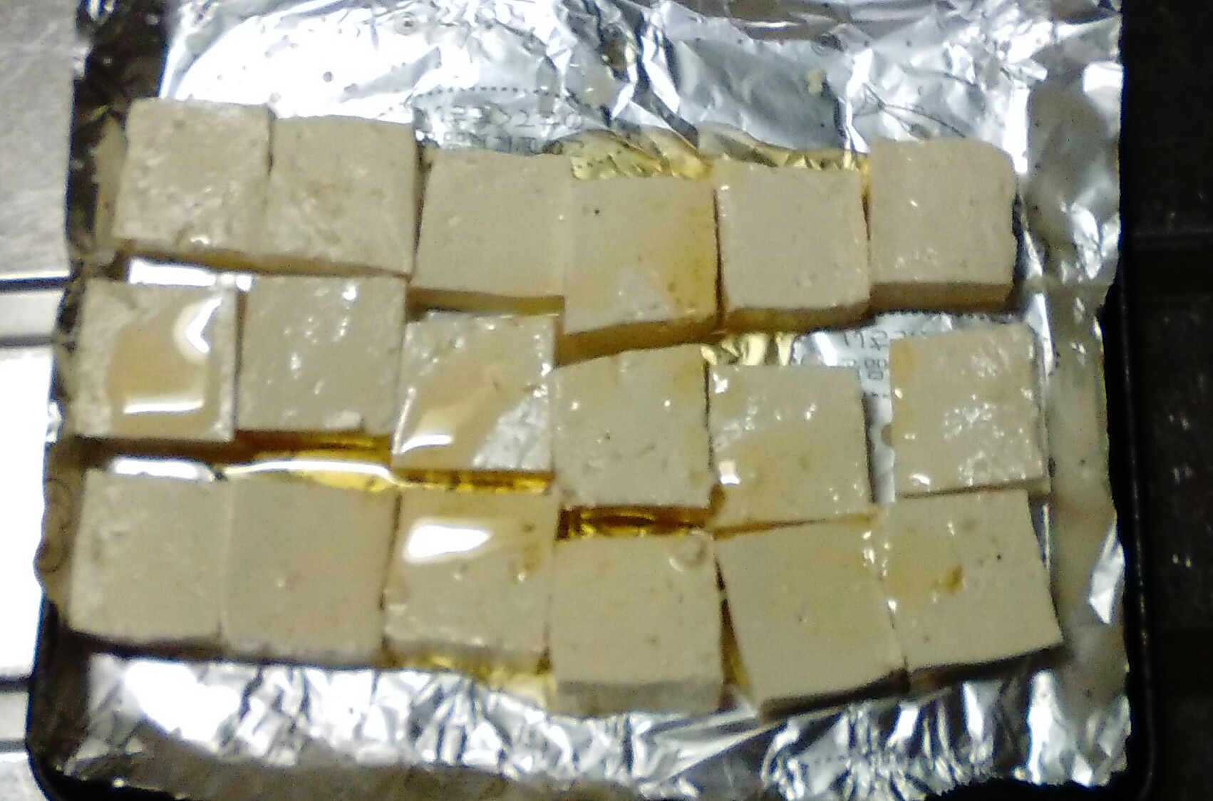 ②木綿豆腐は縦横4㎝、厚み7㎜ほどの大きさに切り、水切り後、くっつかないホイル敷いた鉄板にに乗せ、塩をふり(分量外)、油を回しかけてオーブントースターで20~30分焼く。