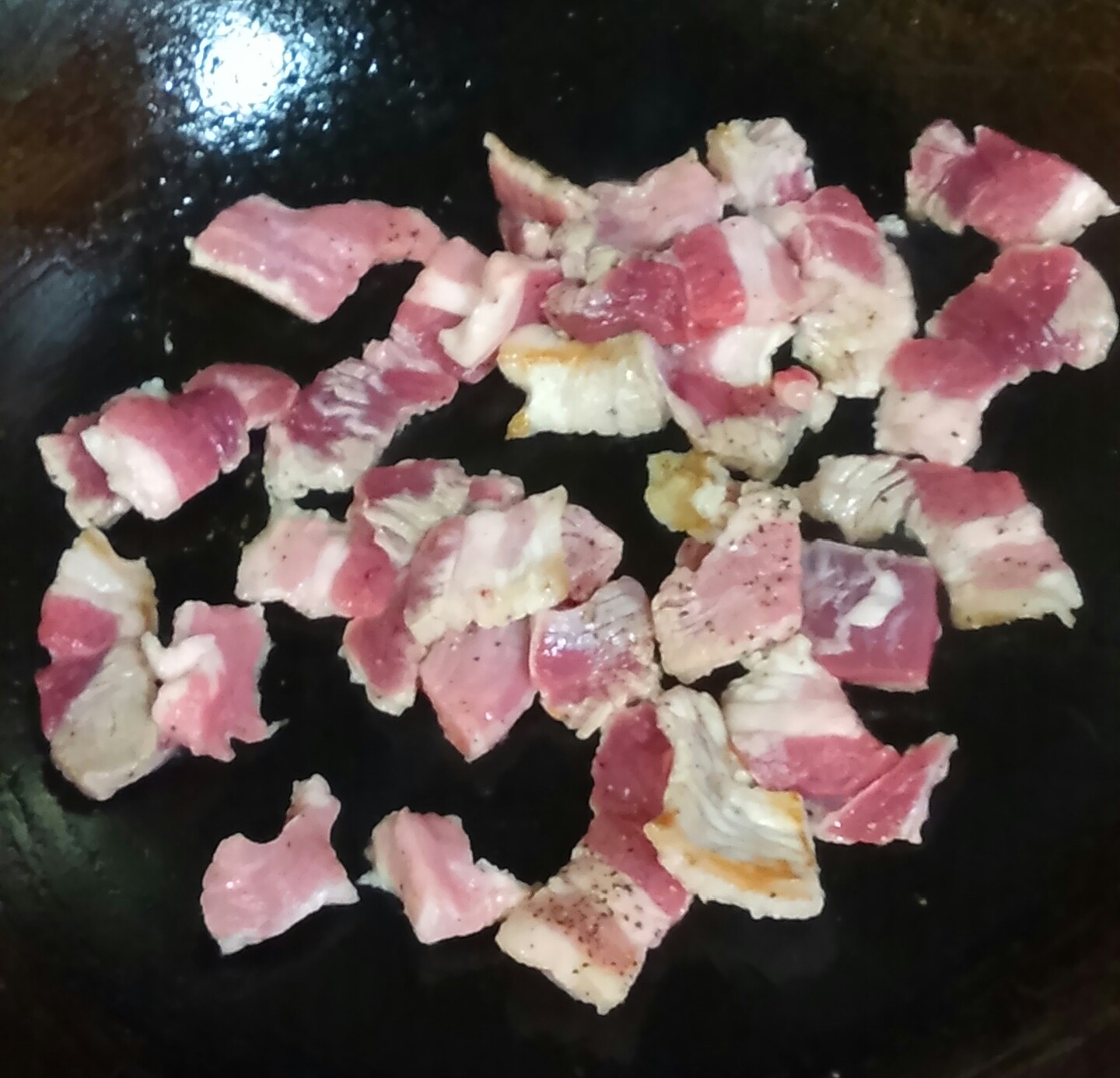 ④フライパンを再度油を入れて熱し、焼き肉用ぐらいの厚みに切った肉を入れ、塩胡椒して炒める。