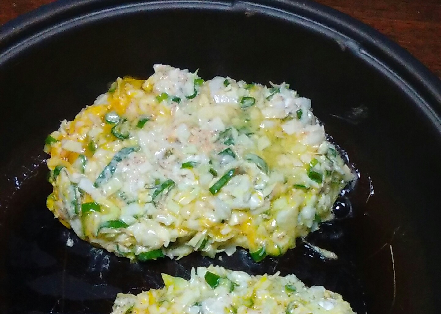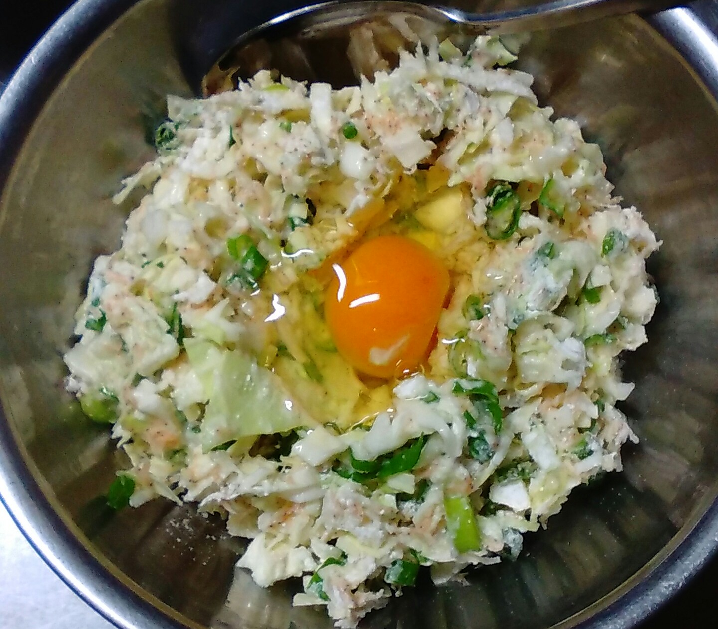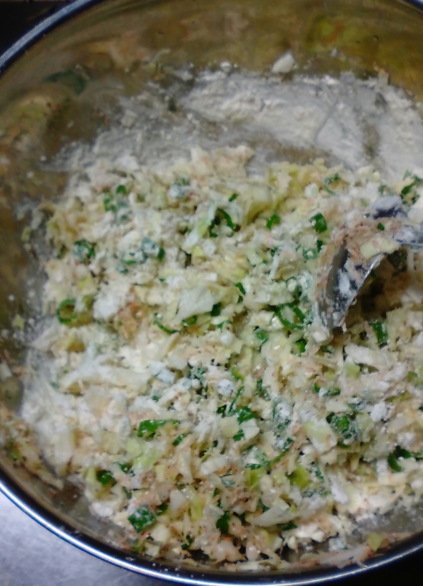 ④ダシ汁に、きざんだキャベツとネギを入れて混ぜる。