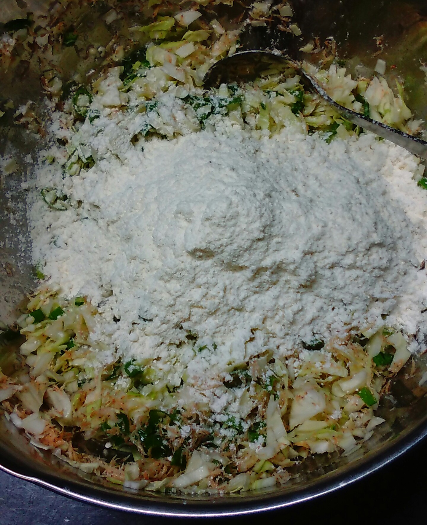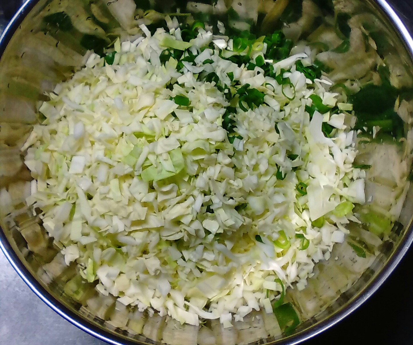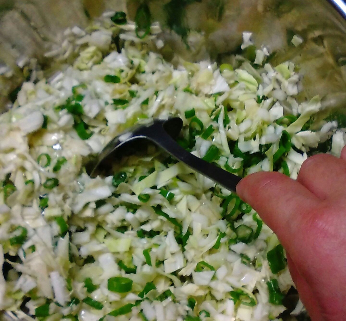 ④ダシ汁に、きざんだキャベツとネギを入れて混ぜる。