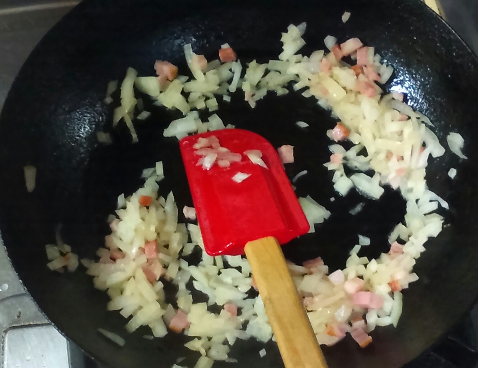 ①フライパンにオリーブ油をひき、みじんぎりにした玉ねぎとベーコンを炒め、ご飯を炒め塩胡椒する。