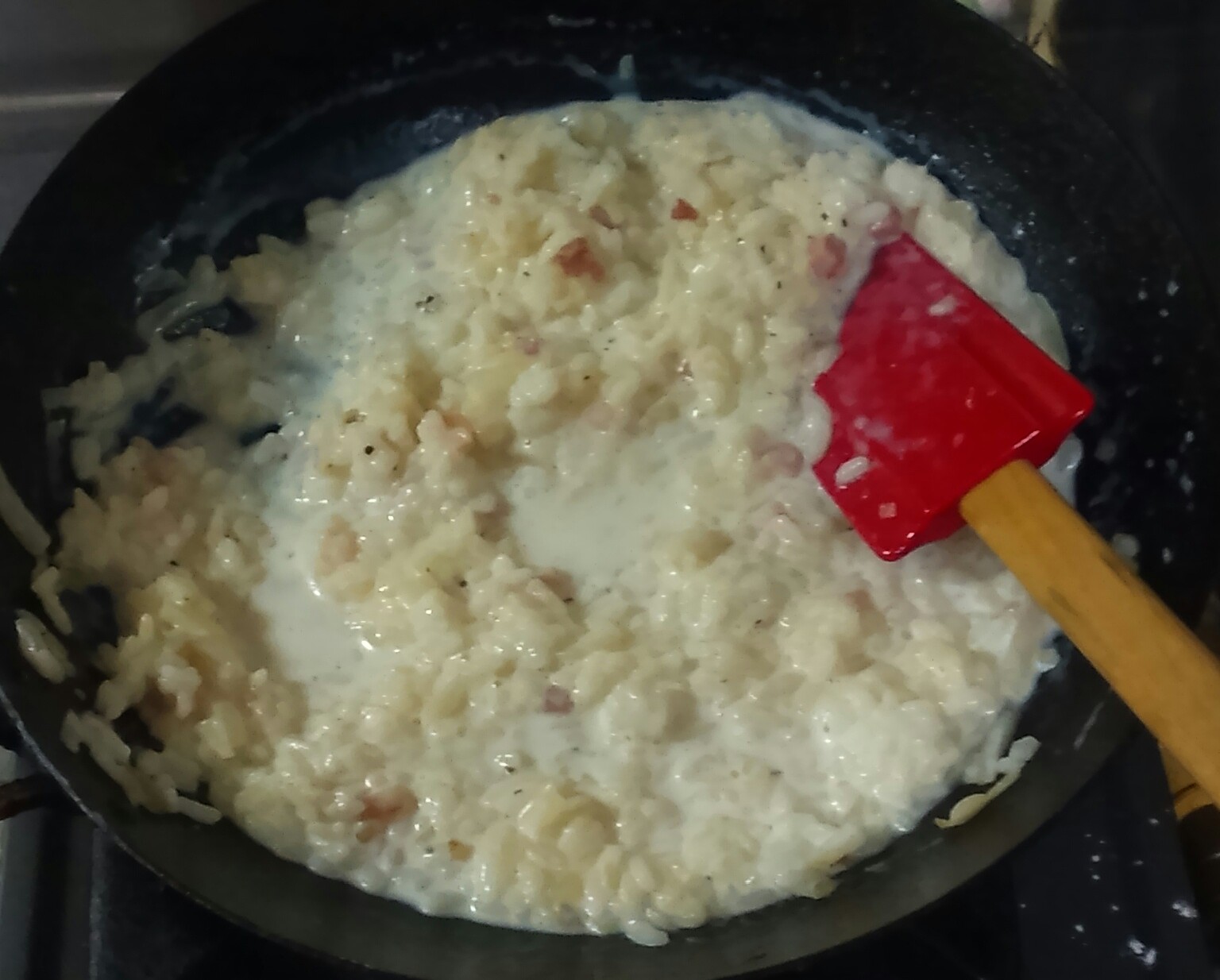 ②薄力粉を振り入れて炒め、牛乳を加えてリゾット位の固さにする。