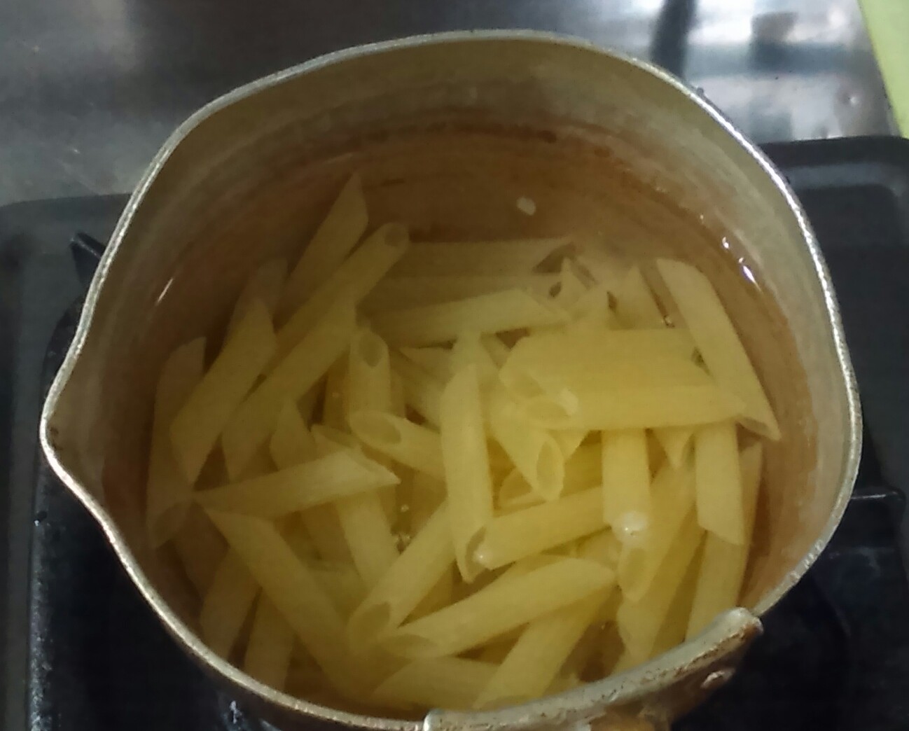 ②沸騰した湯に塩を入れ(分量外)、水を切ったマカロニを入れてさっとゆでる。