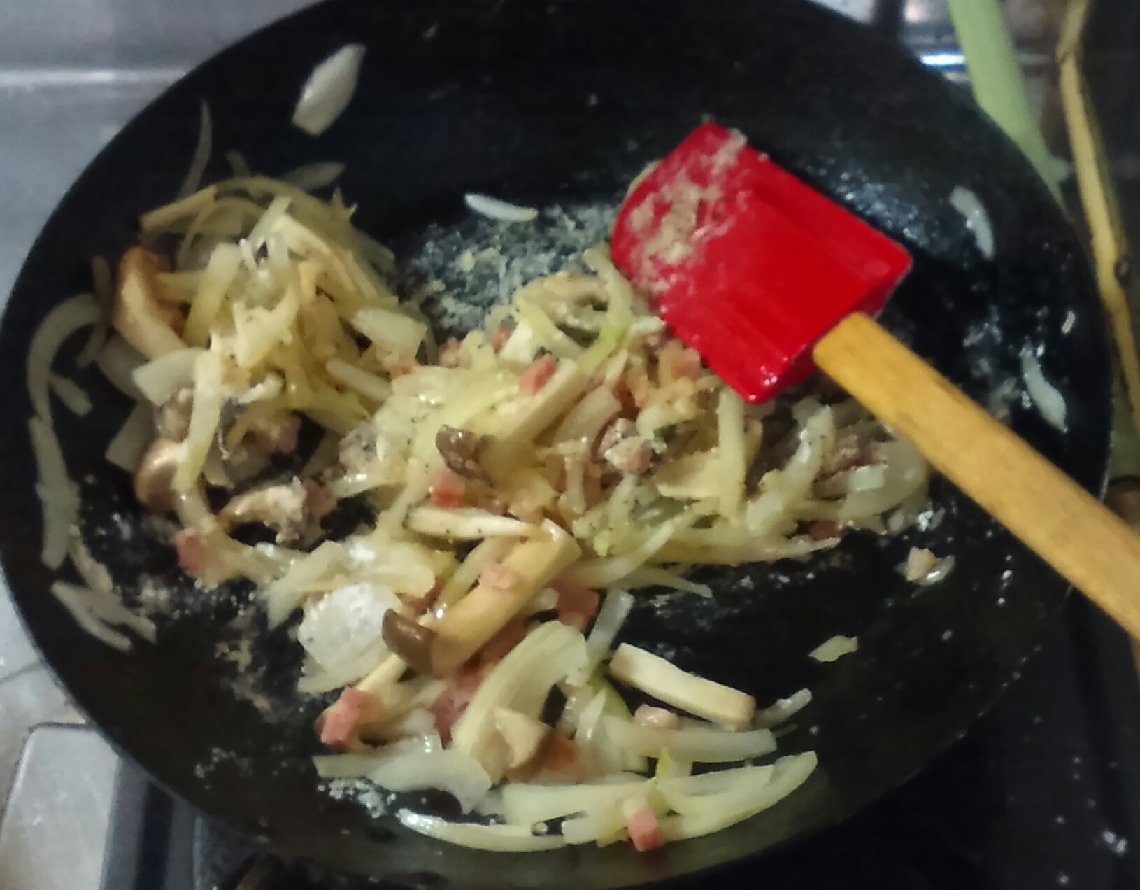 ③フライパンにオリーブ油をひき、スライスした玉ねぎとベーコンとエリンギを炒め、塩胡椒する。