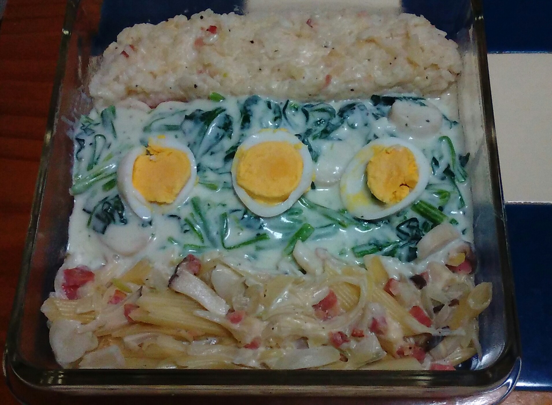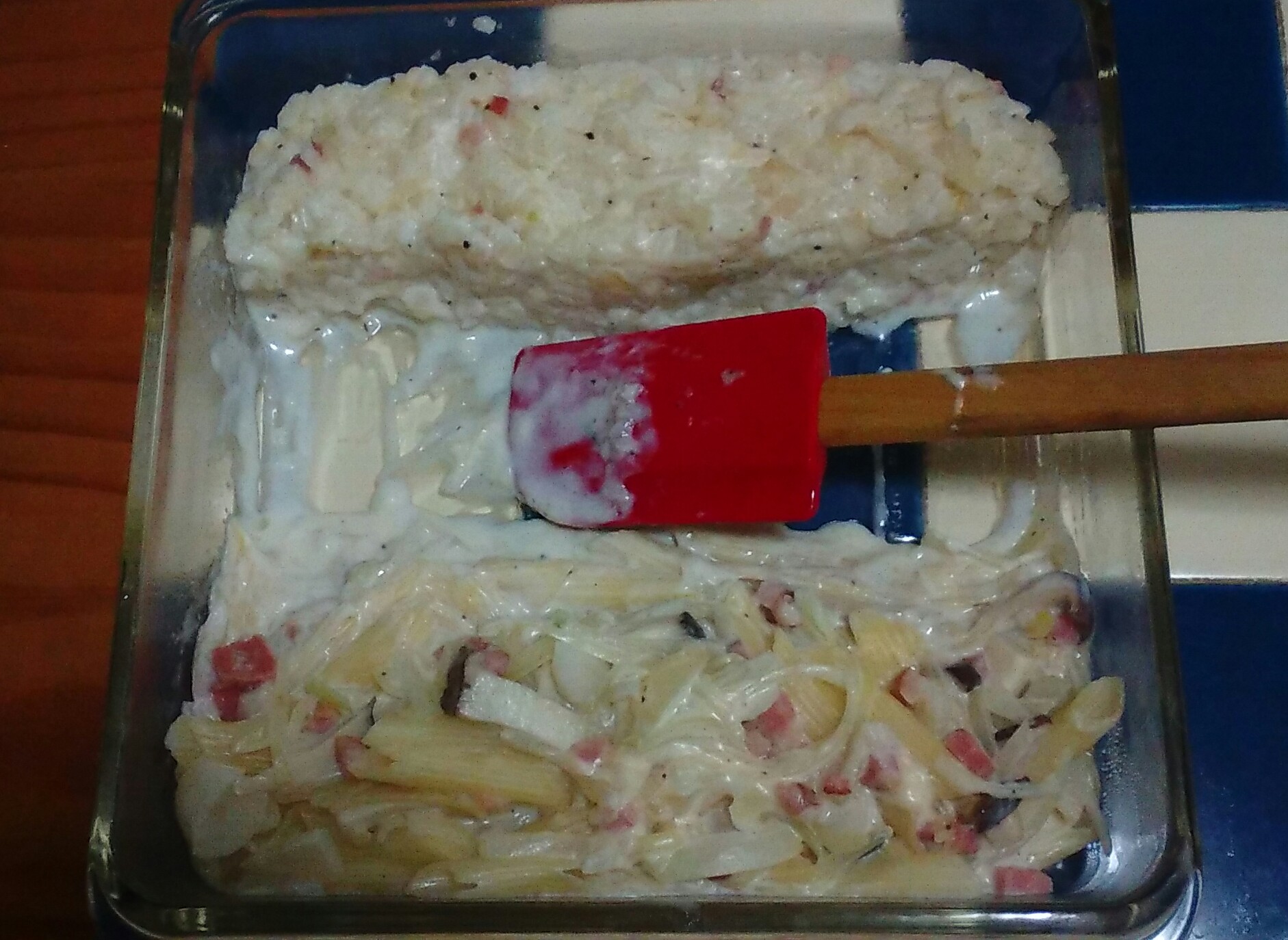そこで、どうせならグラタンも、ドリアも、み~んな一緒で焼けばいいやん、で作ったのが、名付けて『3種のグラタン合わせ焼き』です。