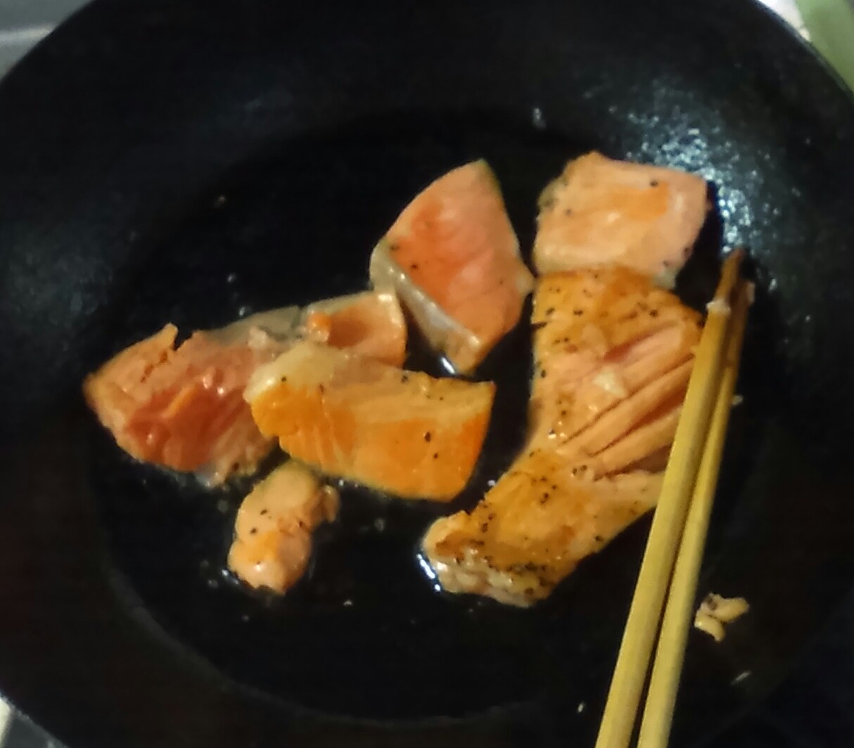 ①フライパンにオリーブ油をひき、鮭を入れて両面焼けたら白ワインをふる。