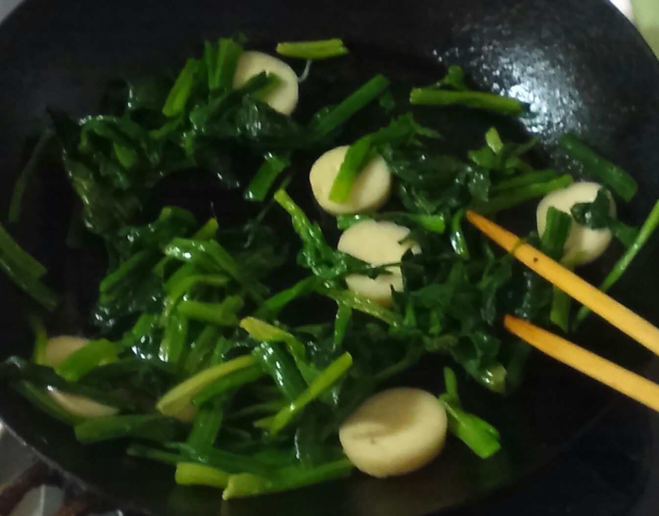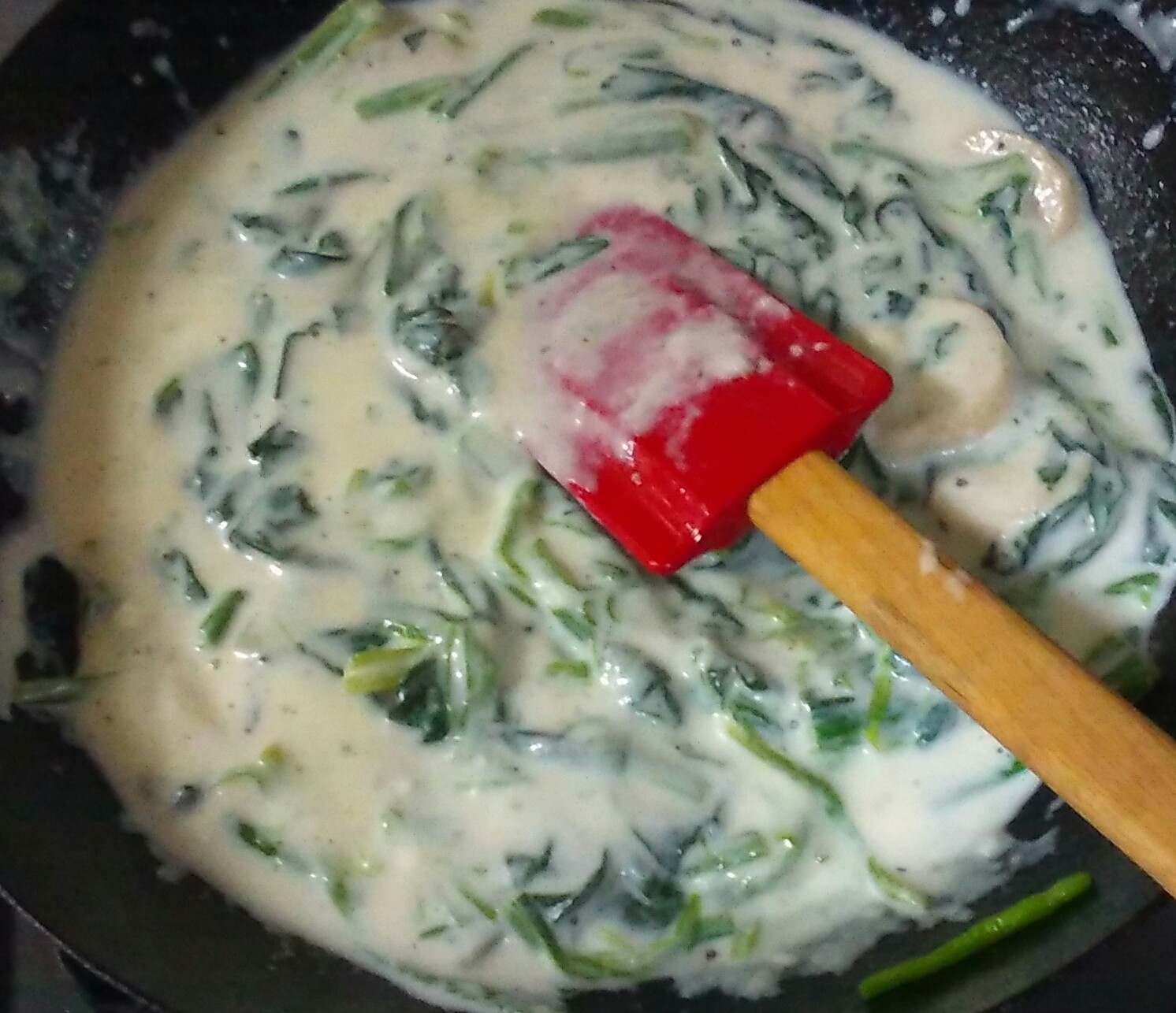 ③エリンギとホウレン草をオリーブ油で炒め、塩胡椒する。