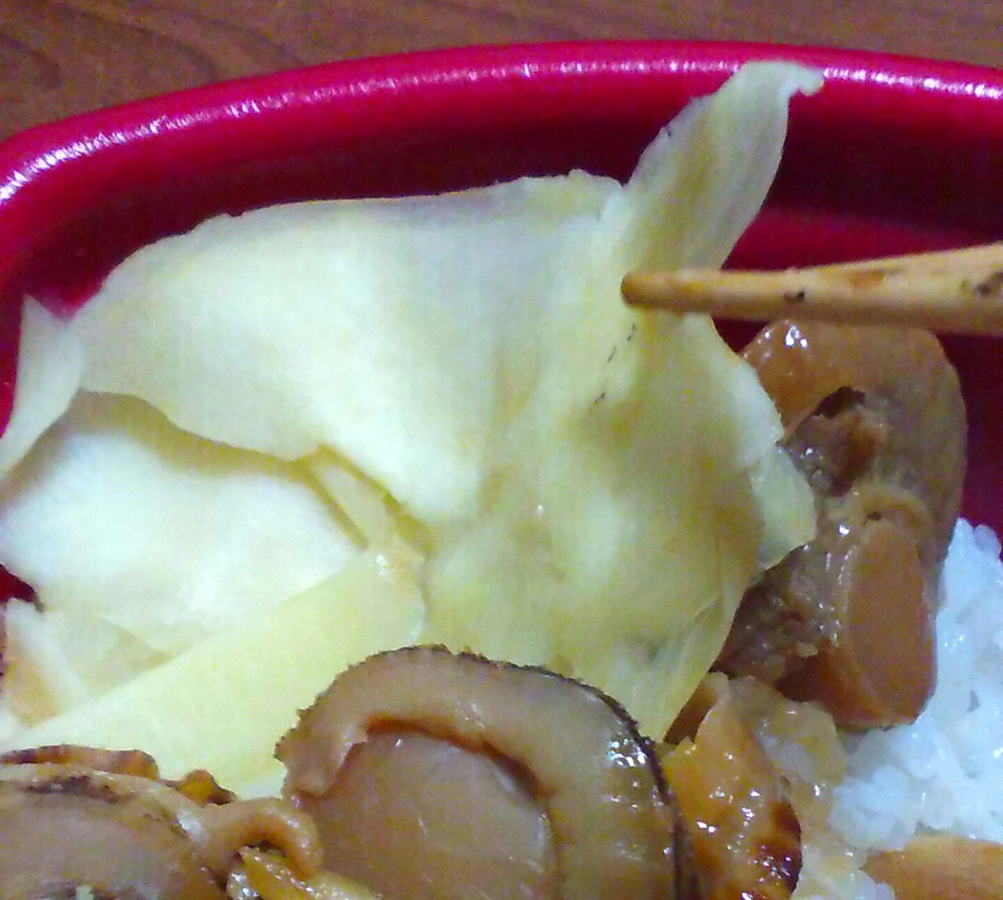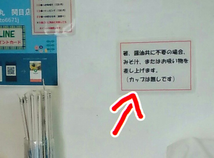 このブログを書くため写真を加工していて気づいたのですが、醤油と箸がいらない場合、味噌汁(すまし汁)と交換できると貼り紙がありました。