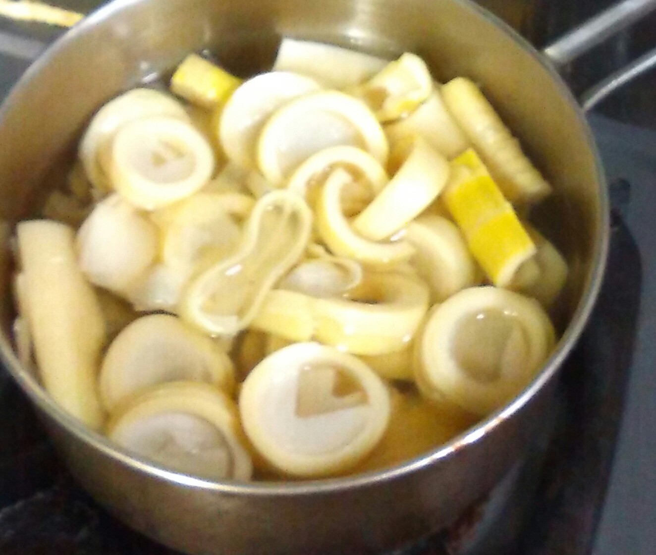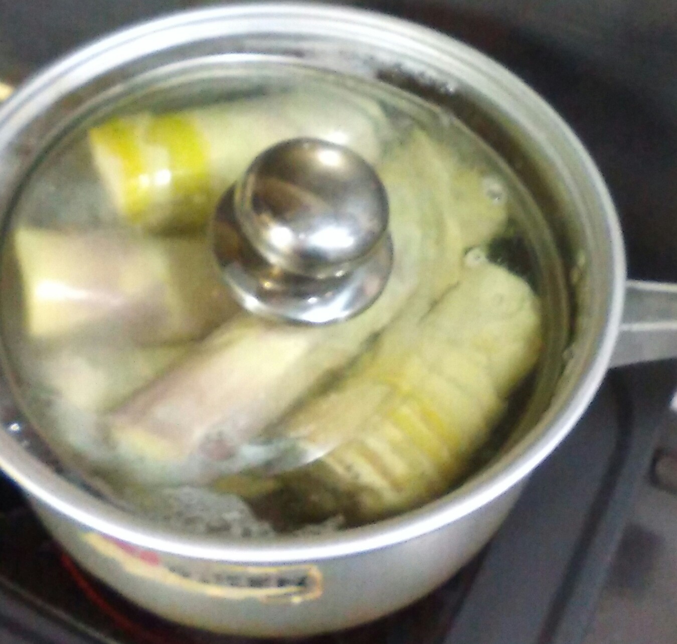 ハチクが浮きあがってくるので、別の鍋のフタを重しがわりにして茹でること約1時間。