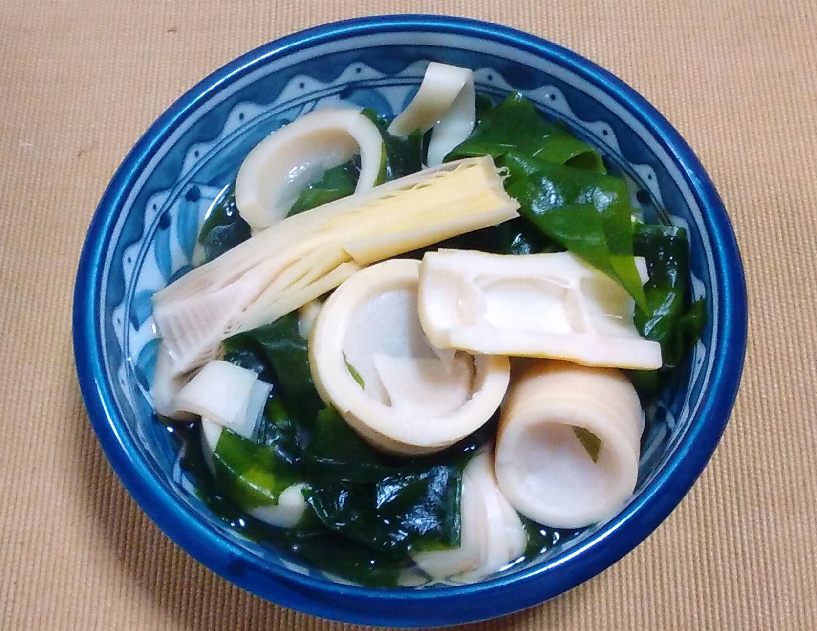 ダシでハチクを煮て醤油で味付けし、最後にワカメを入れたお馴染みの煮物です。