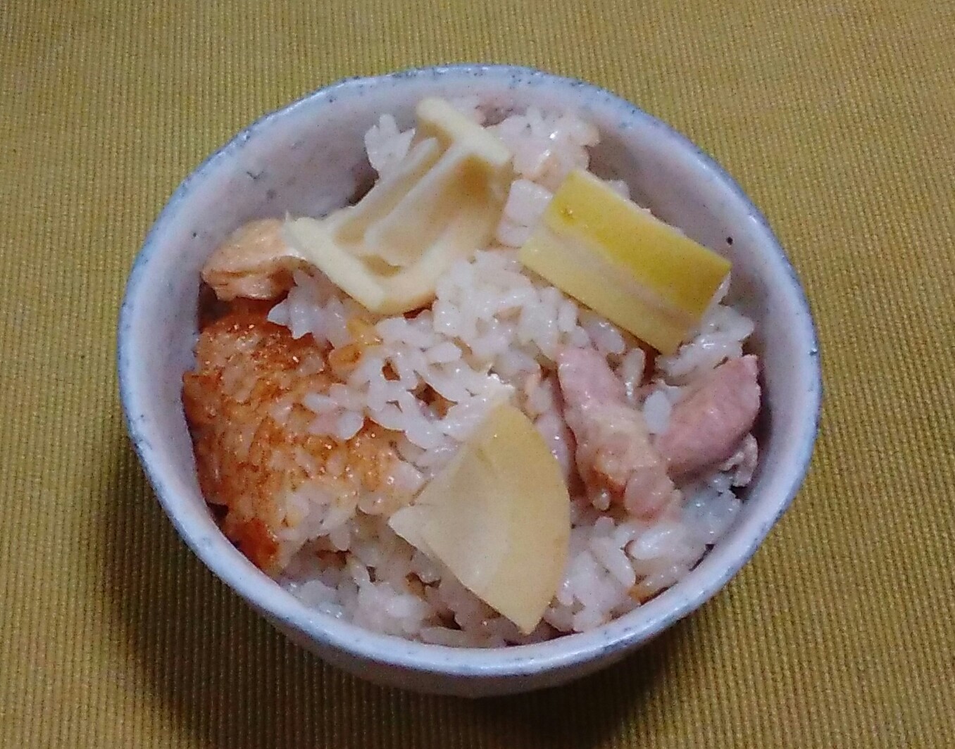 油あげと鶏モモも、ハチクに合わせて大きめにきりましたが、それ以外、基本の作り方はタケノコご飯と同じです。
