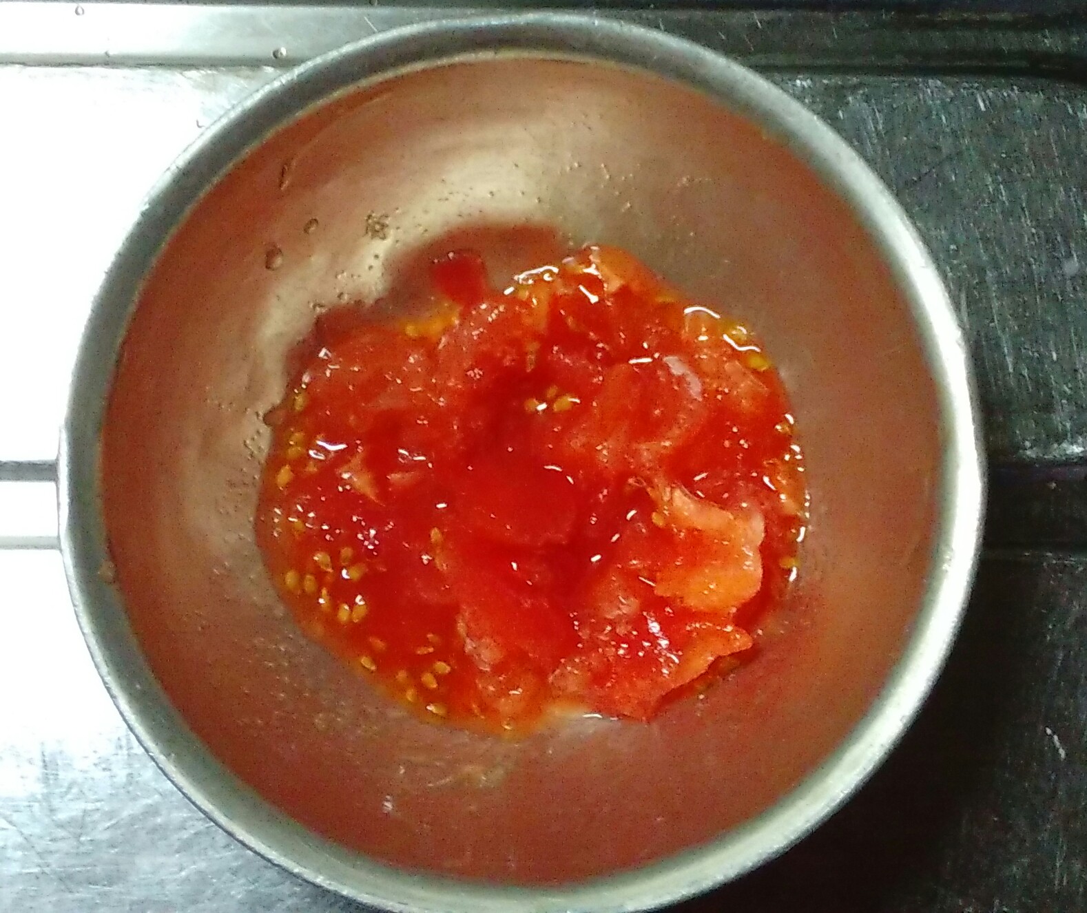 ①トマトを粗くつぶす。