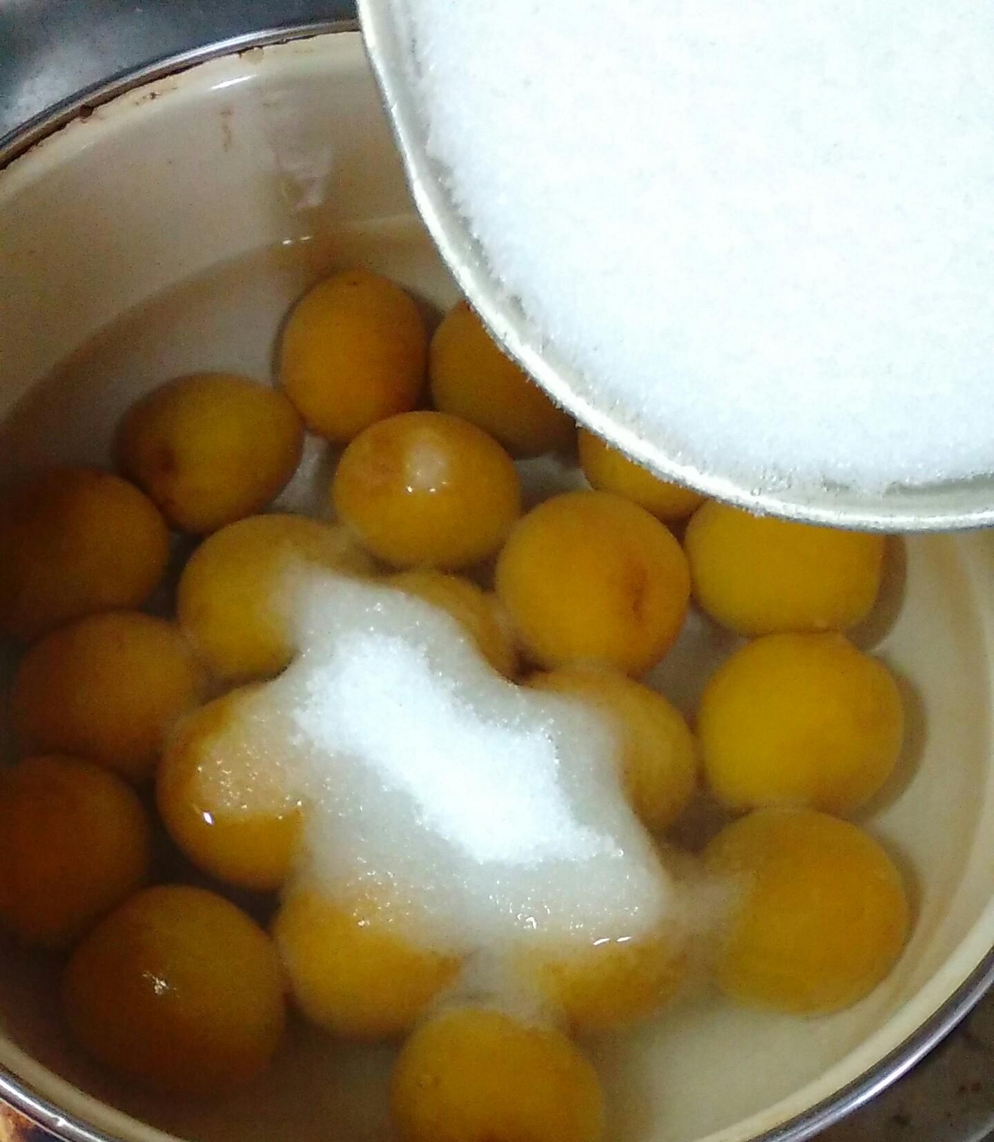 ⑥梅がかぶる位の水と砂糖を入れ火にかける。