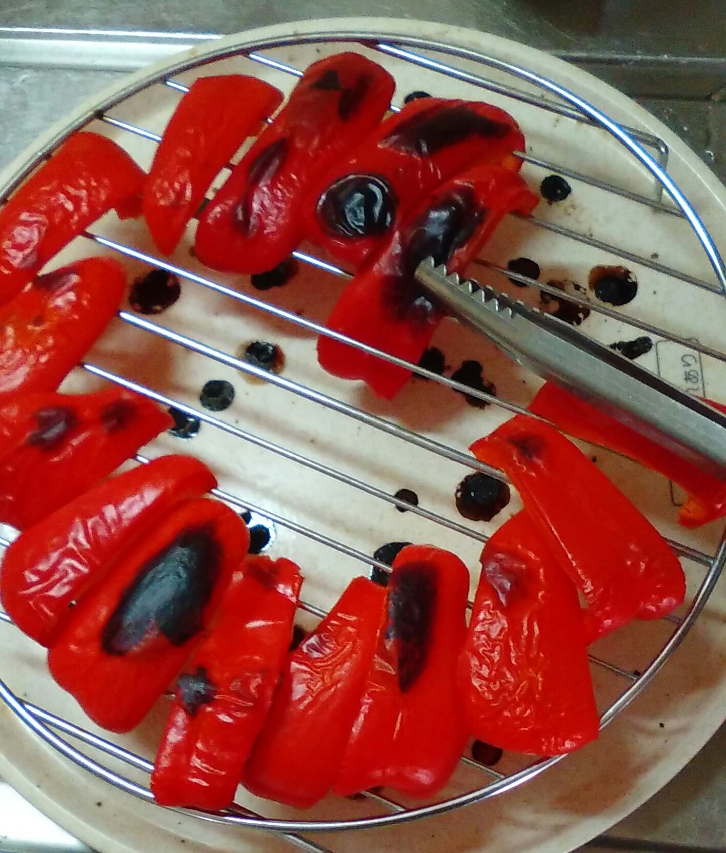①パプリカは串型に切り、オーブンの網に並べる(網に並べるのは皮を上に向けやすくするため)。