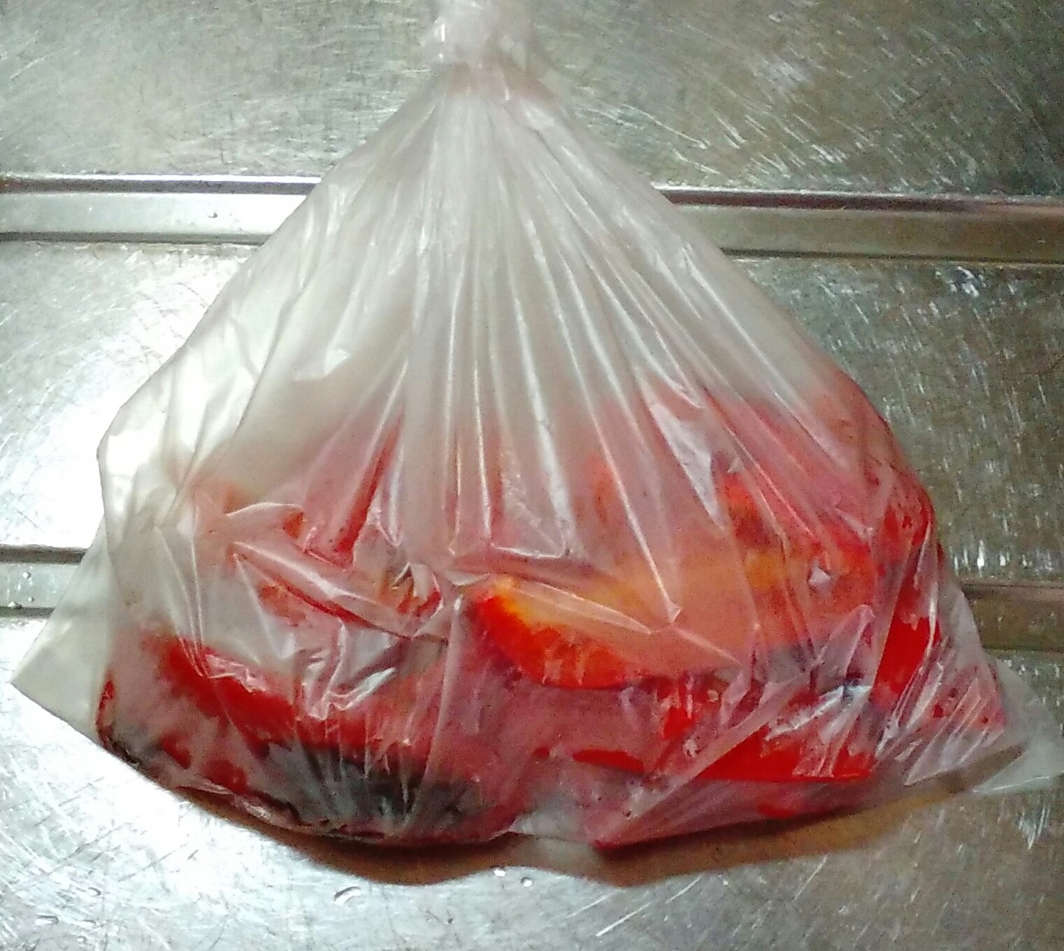 パプリカの皮を楽にむく方法としてビニールに入れて蒸らしてみましたが、あまりスルスルとはむけませんでした。