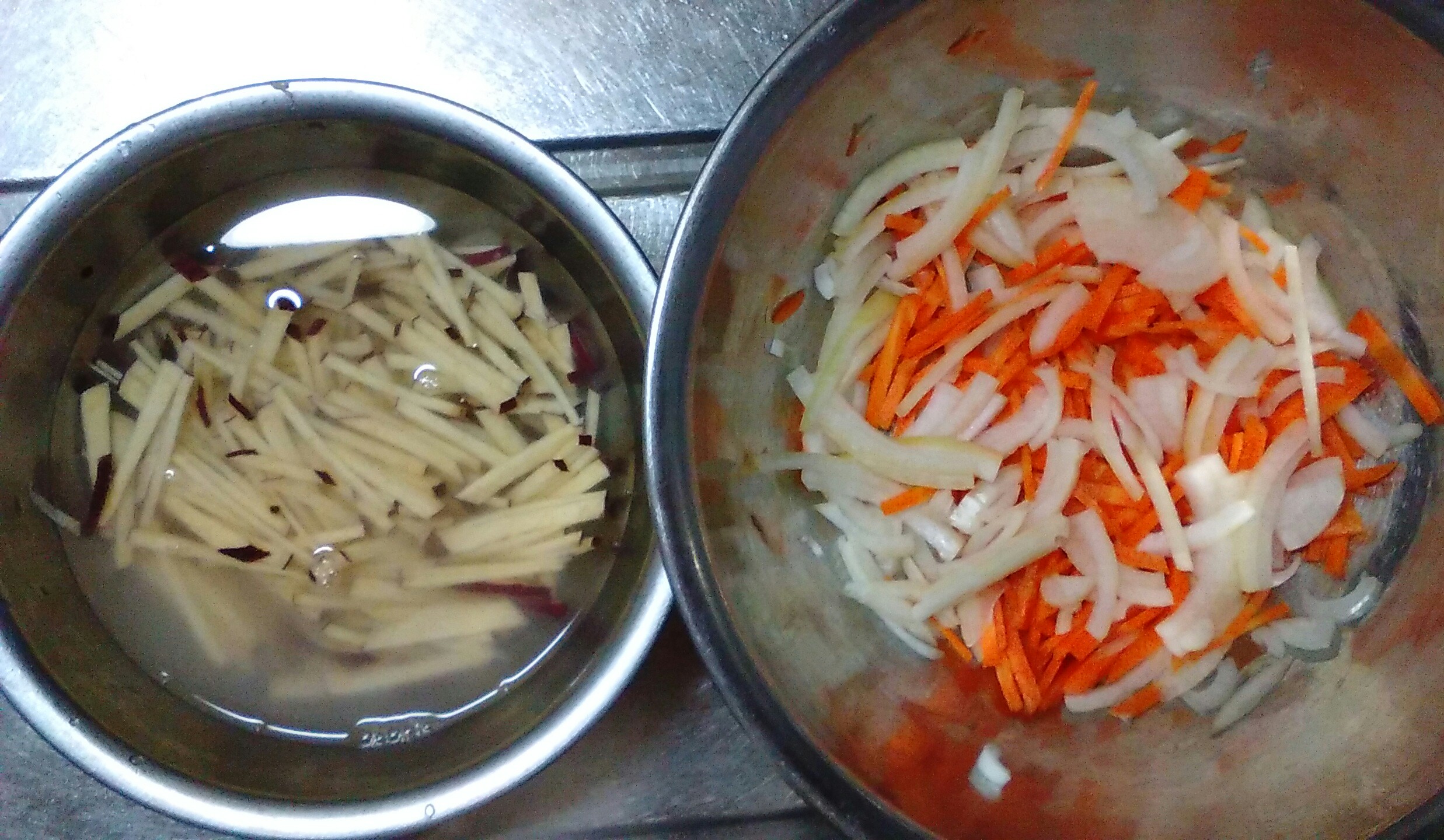 ニンジン、玉ねぎも千切りにする。