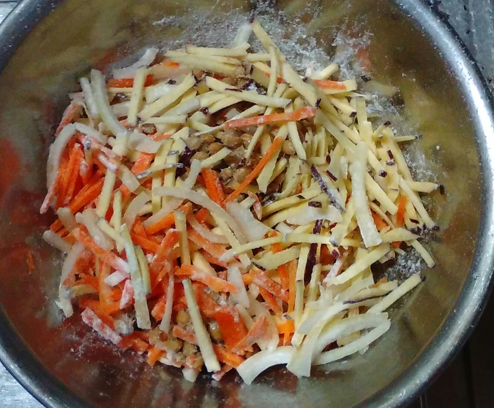 ②野菜と納豆を合わせ、下粉を入れて混ぜる。